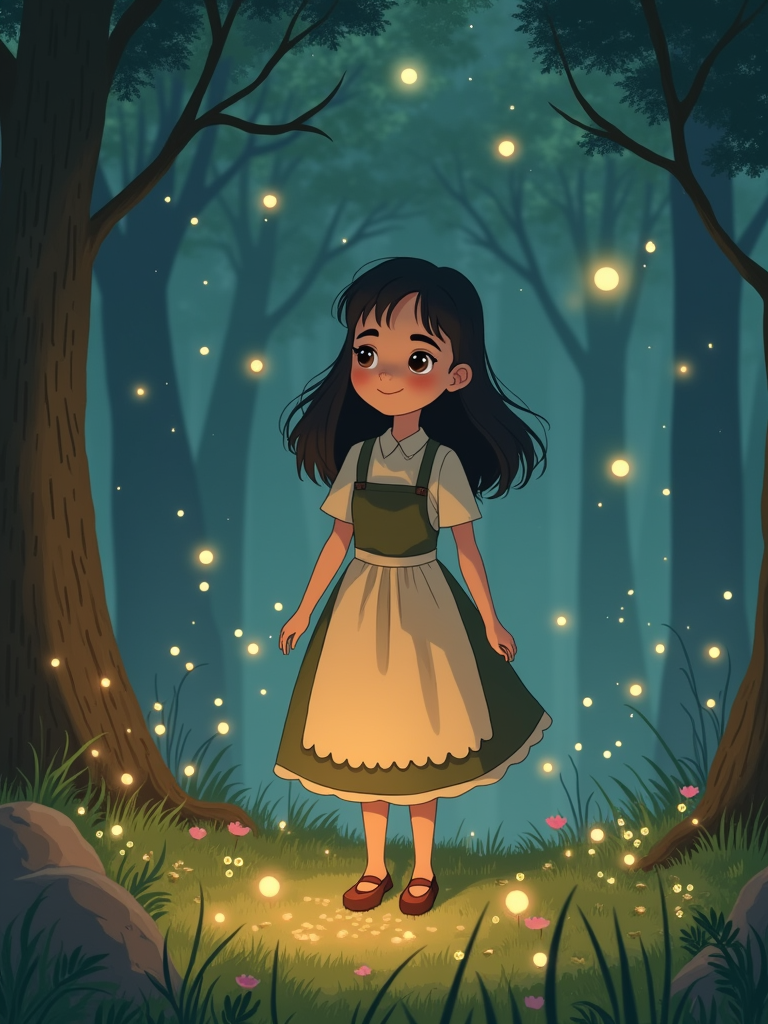 A cozy line art anime-inspired scene featuring a character in a simple dress with an apron and a warm smile , surrounded by magical forest spirits and glowing fireflies. The background has a dreamy forest clearing. The style is gentle and magical like a line art anime film.
