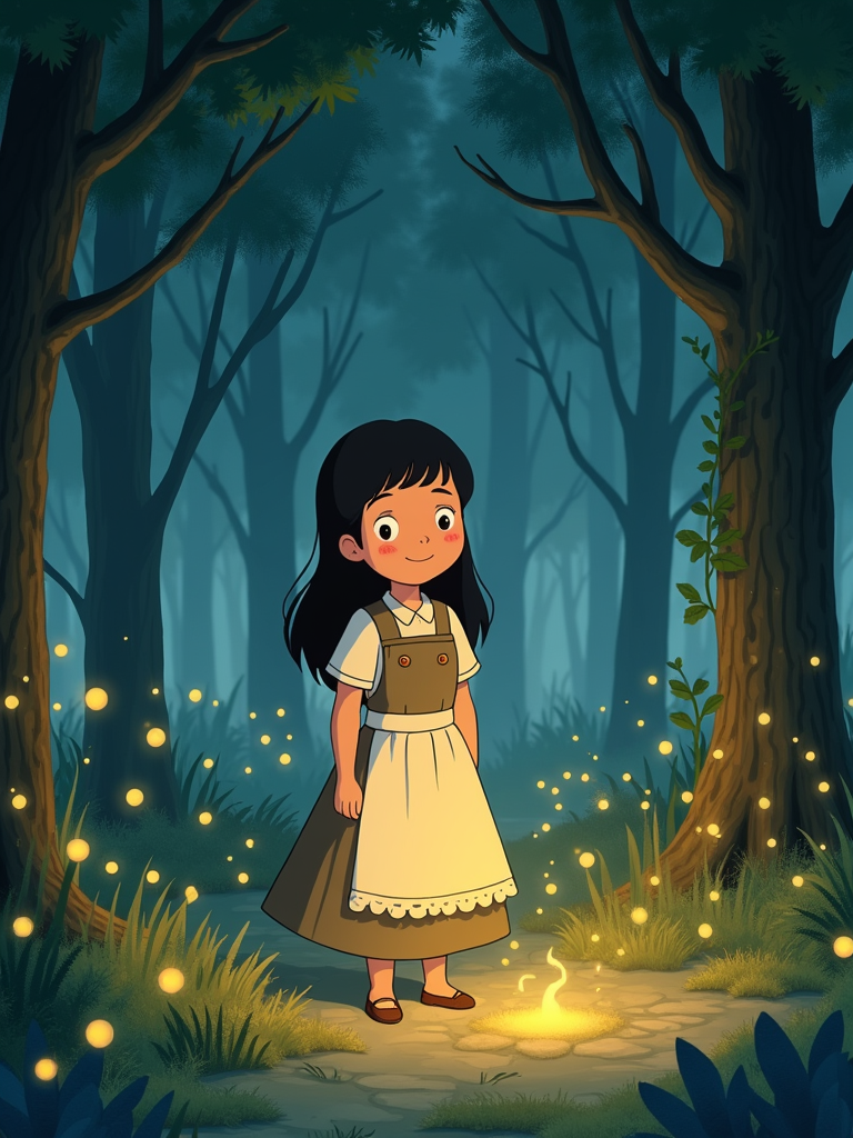 A cozy line art anime-inspired scene featuring a character in a simple dress with an apron and a warm smile , surrounded by magical forest spirits and glowing fireflies. The background has a dreamy forest clearing. The style is gentle and magical like a line art anime film.