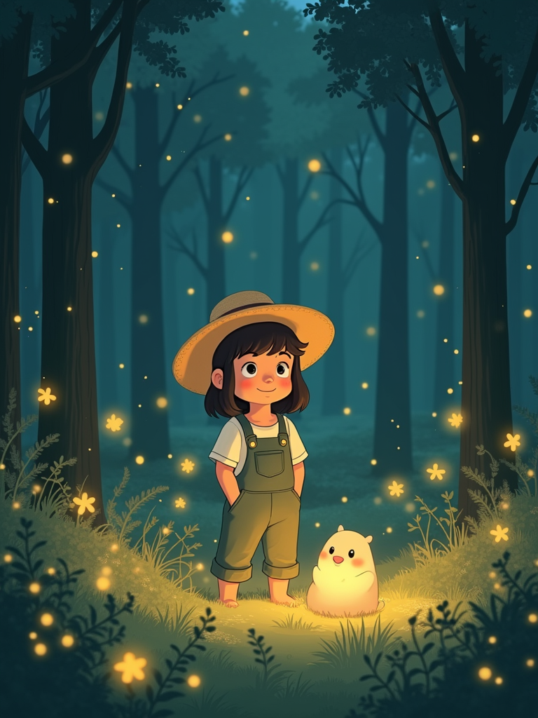 A cozy line art anime-inspired scene featuring a character in comfortable overalls and a straw hat, surrounded by magical forest spirits and glowing fireflies. The background has a dreamy forest clearing. The style is gentle and magical like a line art anime film.