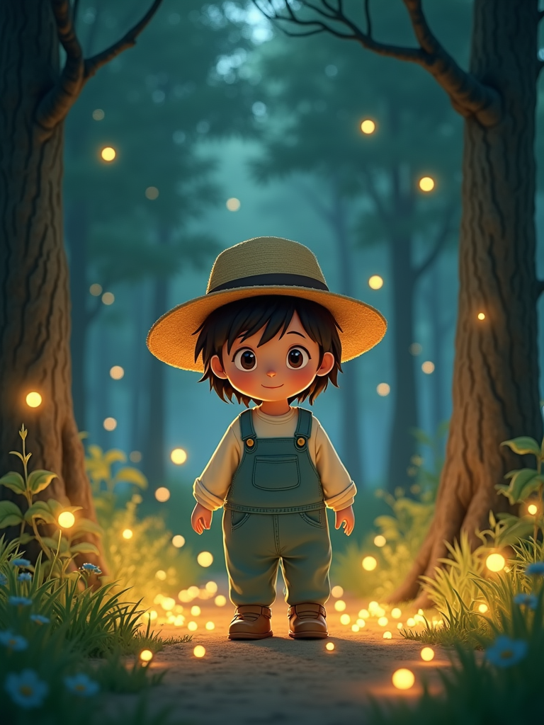 A cozy line art anime-inspired scene featuring a character in comfortable overalls and a straw hat, surrounded by magical forest spirits and glowing fireflies. The background has a dreamy forest clearing. The style is gentle and magical like a line art anime film.