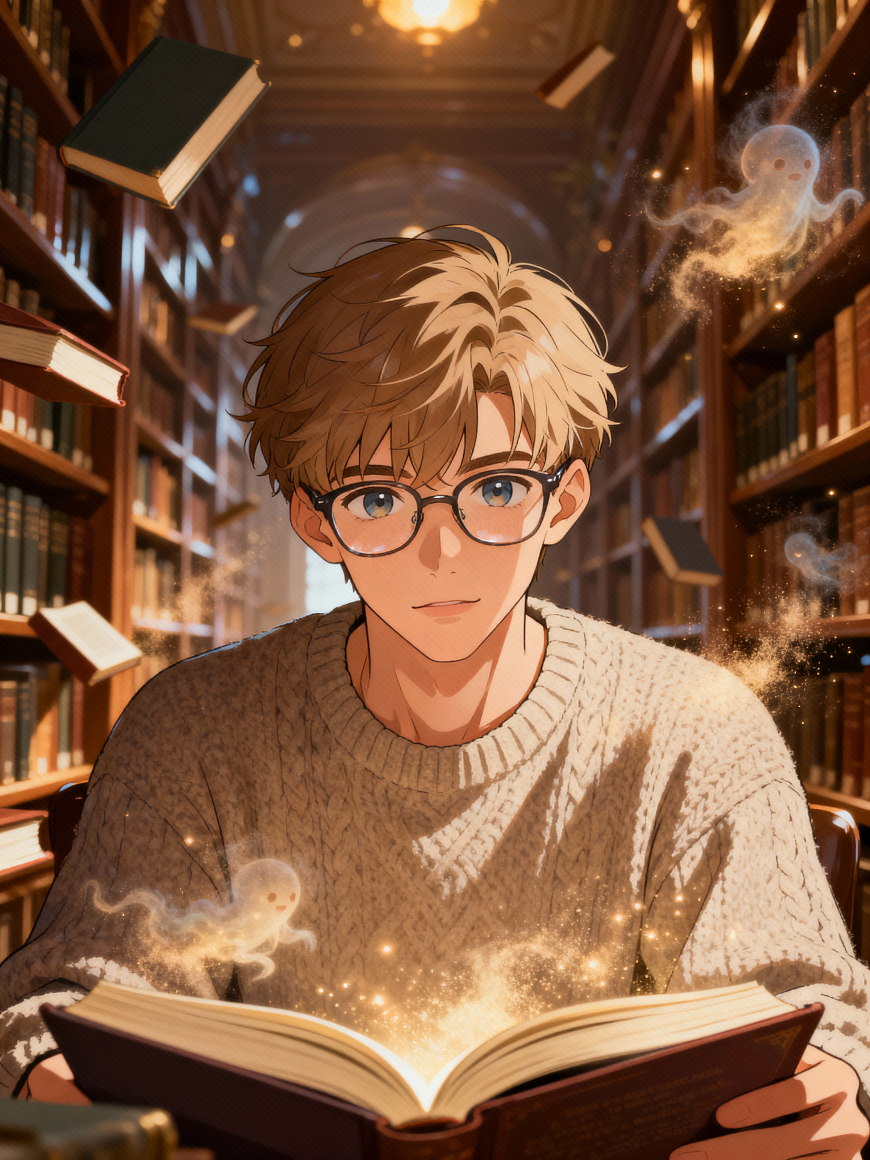 A cozy line art anime portrait in a magical library, with model as the character wearing a comfortable sweater and reading glasses, surrounded by floating books and dust spirits. The library has endless shelves and warm lighting. The style is warm.
