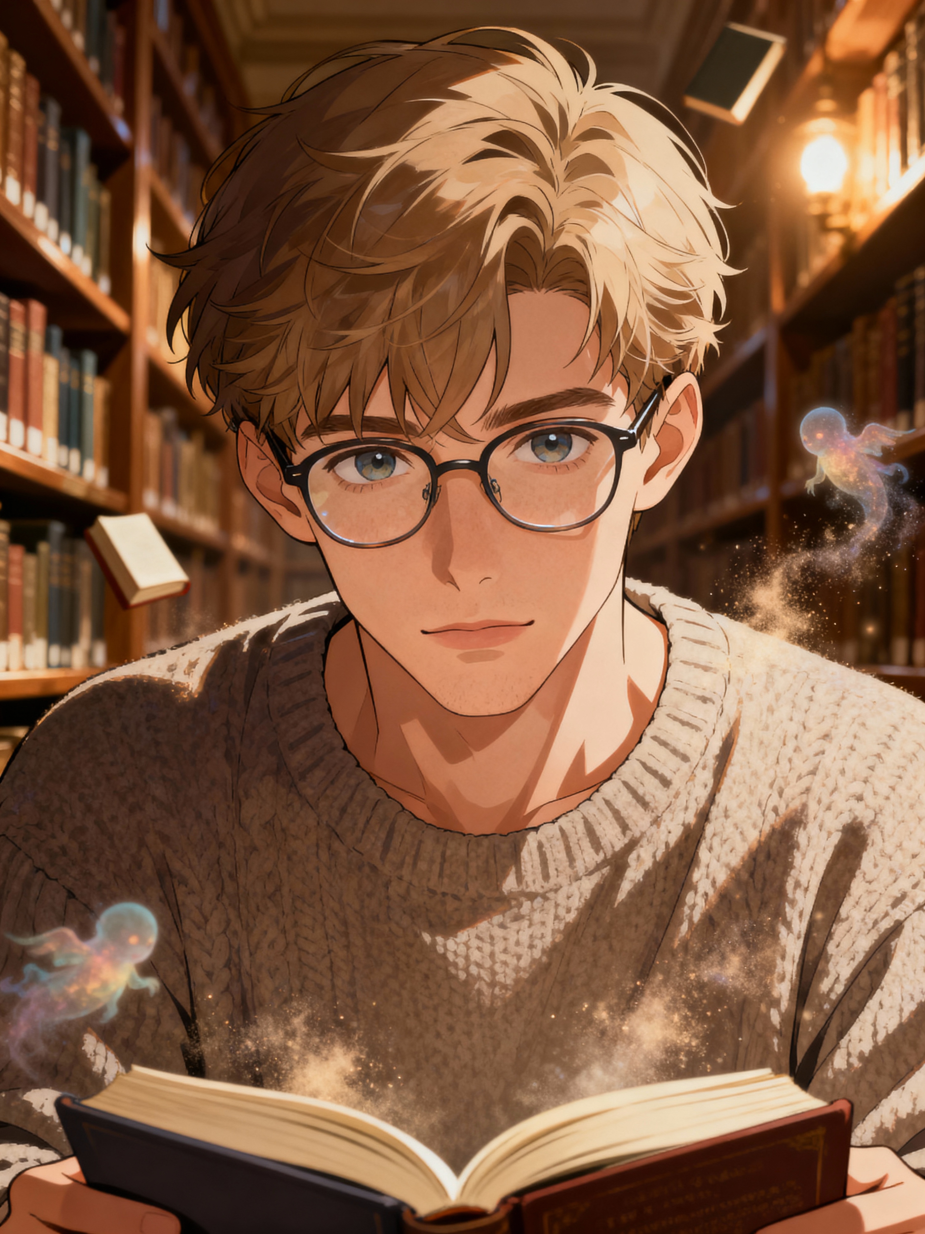 A cozy line art anime portrait in a magical library, with model as the character wearing a comfortable sweater and reading glasses, surrounded by floating books and dust spirits. The library has endless shelves and warm lighting. The style is warm.