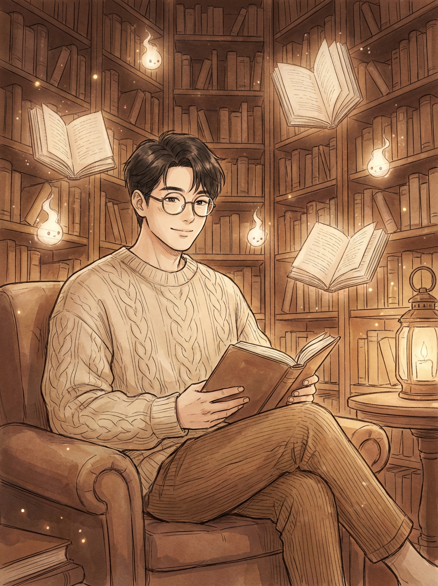 A cozy line art anime portrait in a magical library, with model as the character wearing a comfortable sweater and reading glasses, surrounded by floating books and dust spirits. The library has endless shelves and warm lighting. The style is warm.