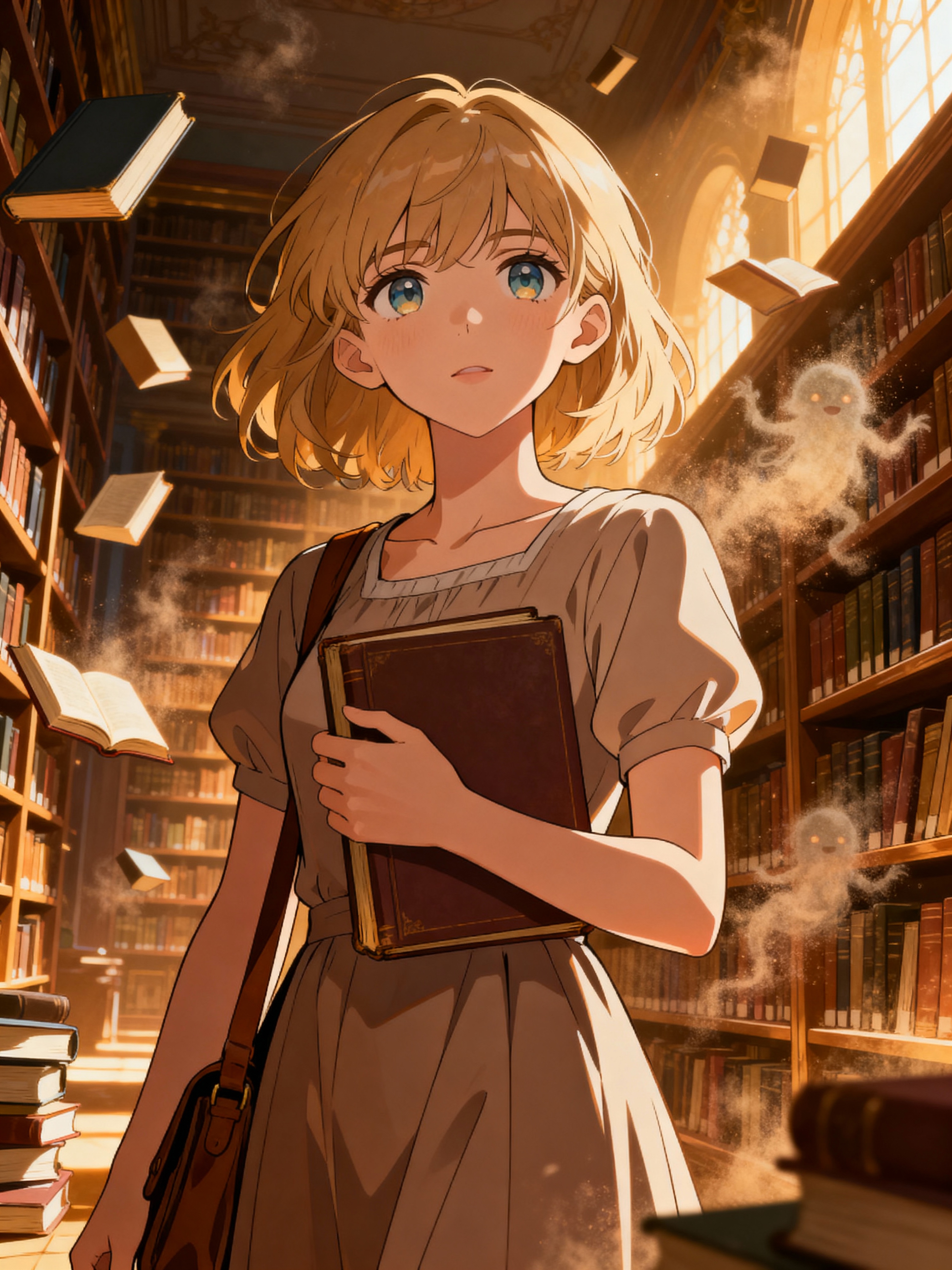 A cozy line art anime portrait in a magical library, with model as the character wearing a simple dress with a book bag , surrounded by floating books and dust spirits. The library has endless shelves and warm lighting. The style is warm.