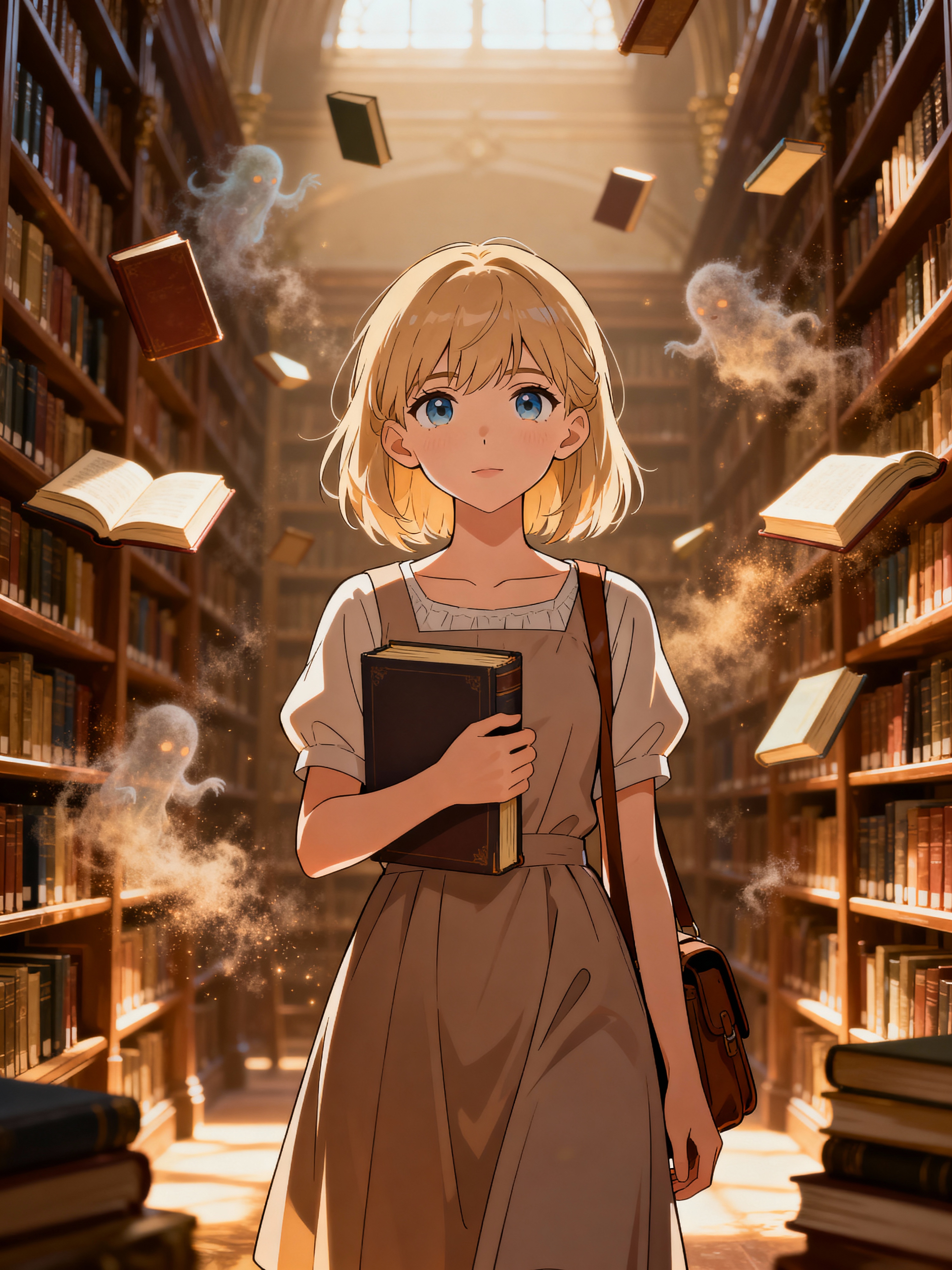 A cozy line art anime portrait in a magical library, with model as the character wearing a simple dress with a book bag , surrounded by floating books and dust spirits. The library has endless shelves and warm lighting. The style is warm.