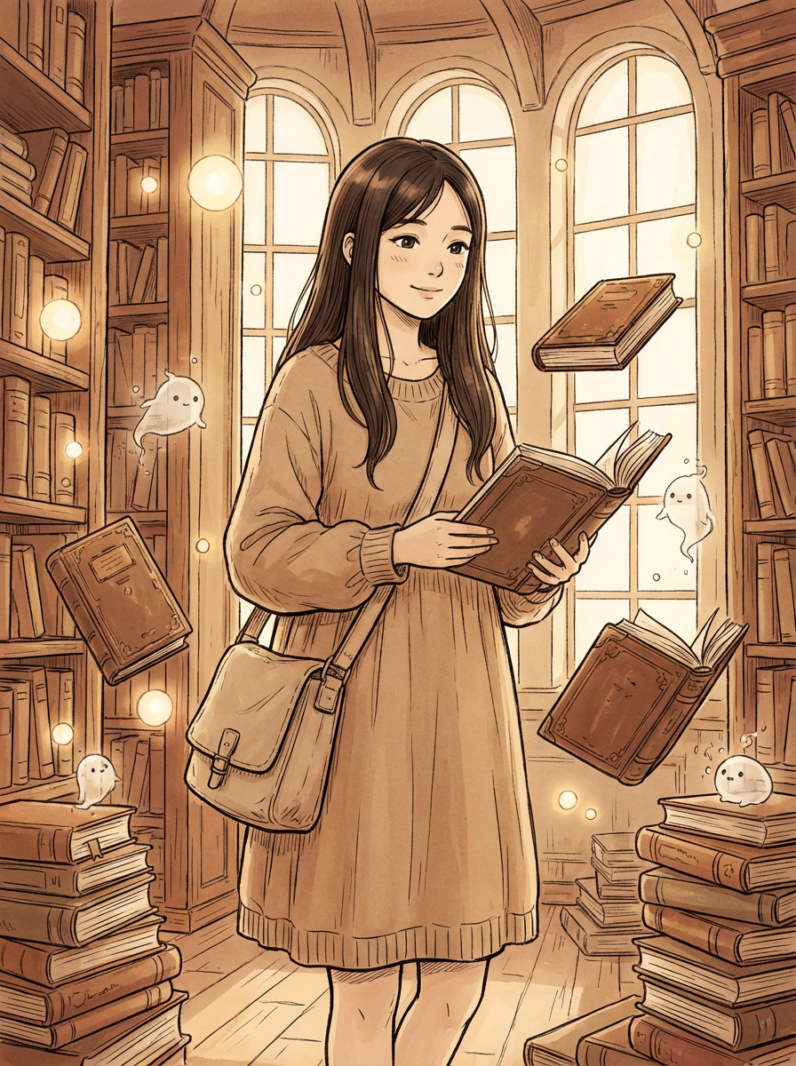 A cozy line art anime portrait in a magical library, with model as the character wearing a simple dress with a book bag , surrounded by floating books and dust spirits. The library has endless shelves and warm lighting. The style is warm.