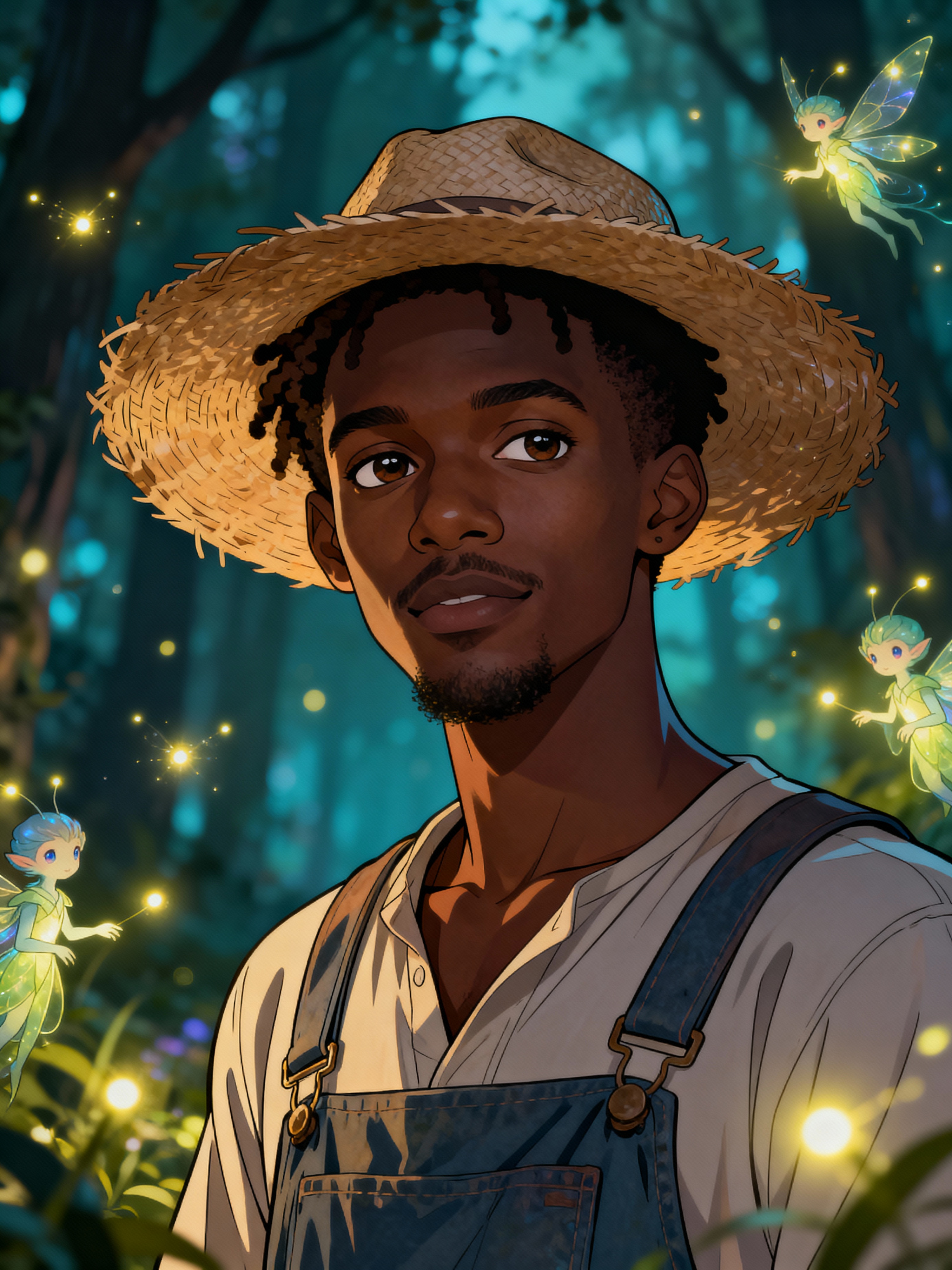 A cozy line art anime scene featuring model as a character in comfortable overalls and a straw hat, surrounded by magical forest spirits and glowing fireflies. The background has a dreamy forest clearing. The style is gentle and magical.