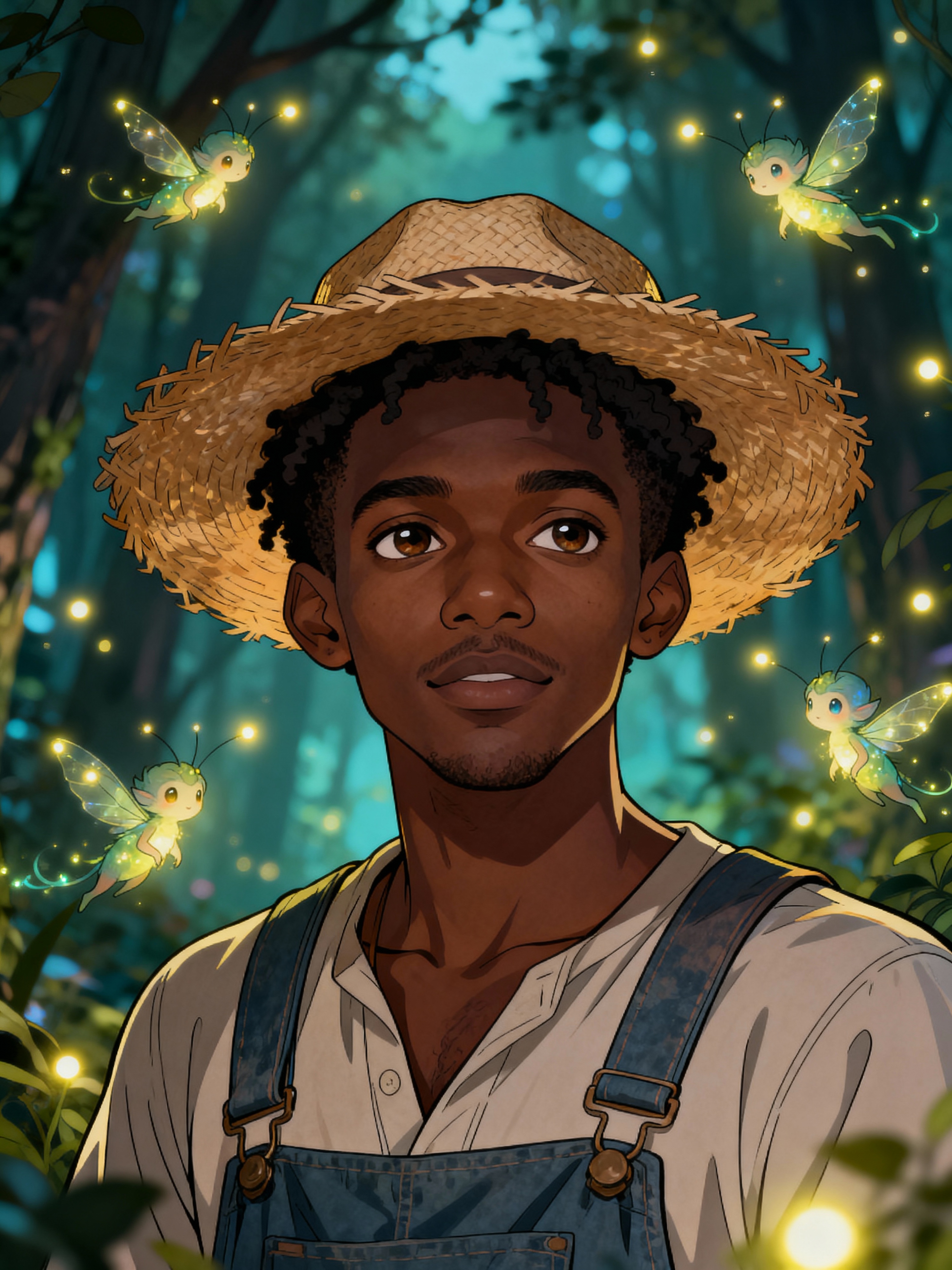 A cozy line art anime scene featuring model as a character in comfortable overalls and a straw hat, surrounded by magical forest spirits and glowing fireflies. The background has a dreamy forest clearing. The style is gentle and magical.