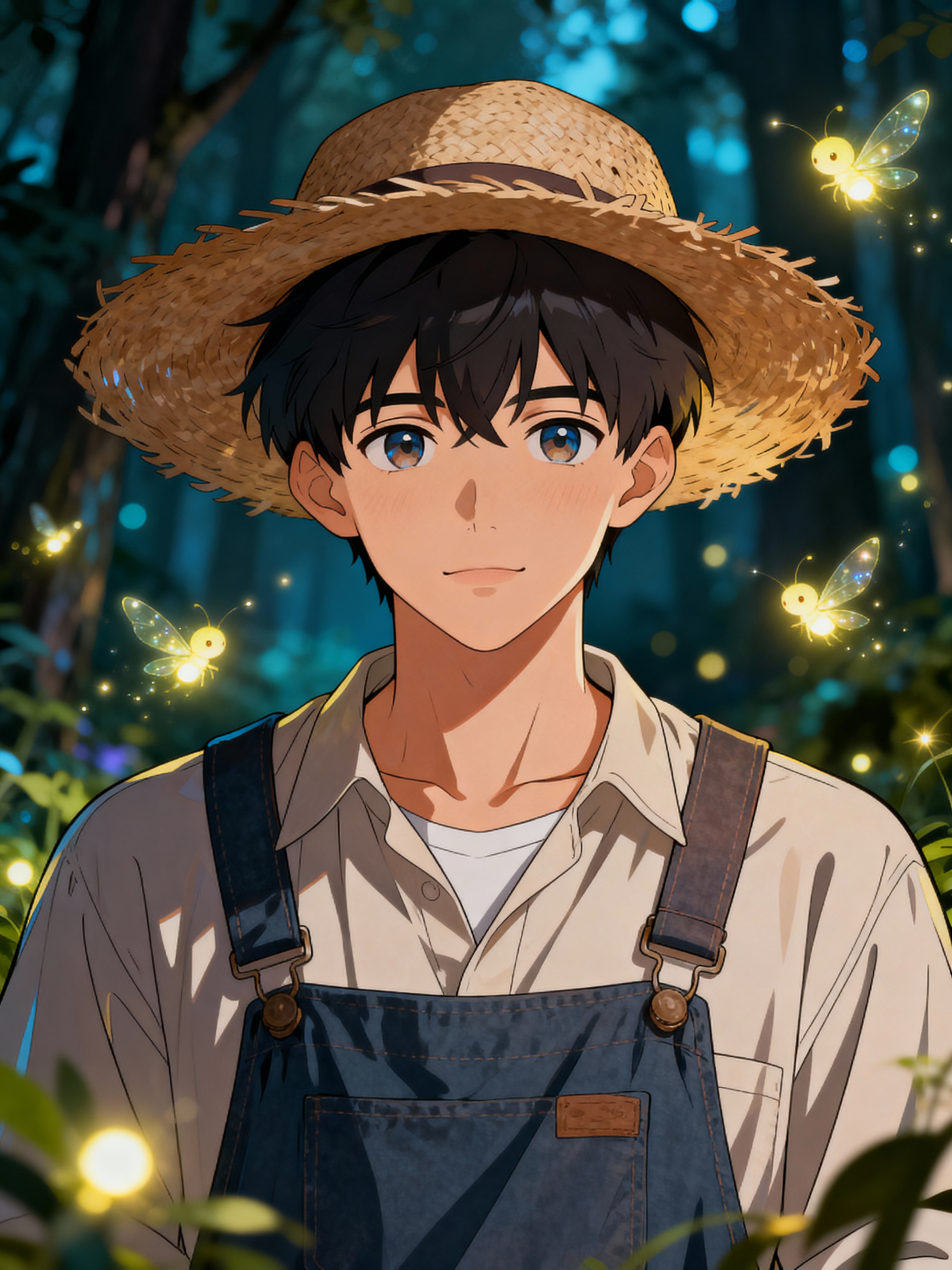 A cozy line art anime scene featuring model as a character in comfortable overalls and a straw hat, surrounded by magical forest spirits and glowing fireflies. The background has a dreamy forest clearing. The style is gentle and magical.
