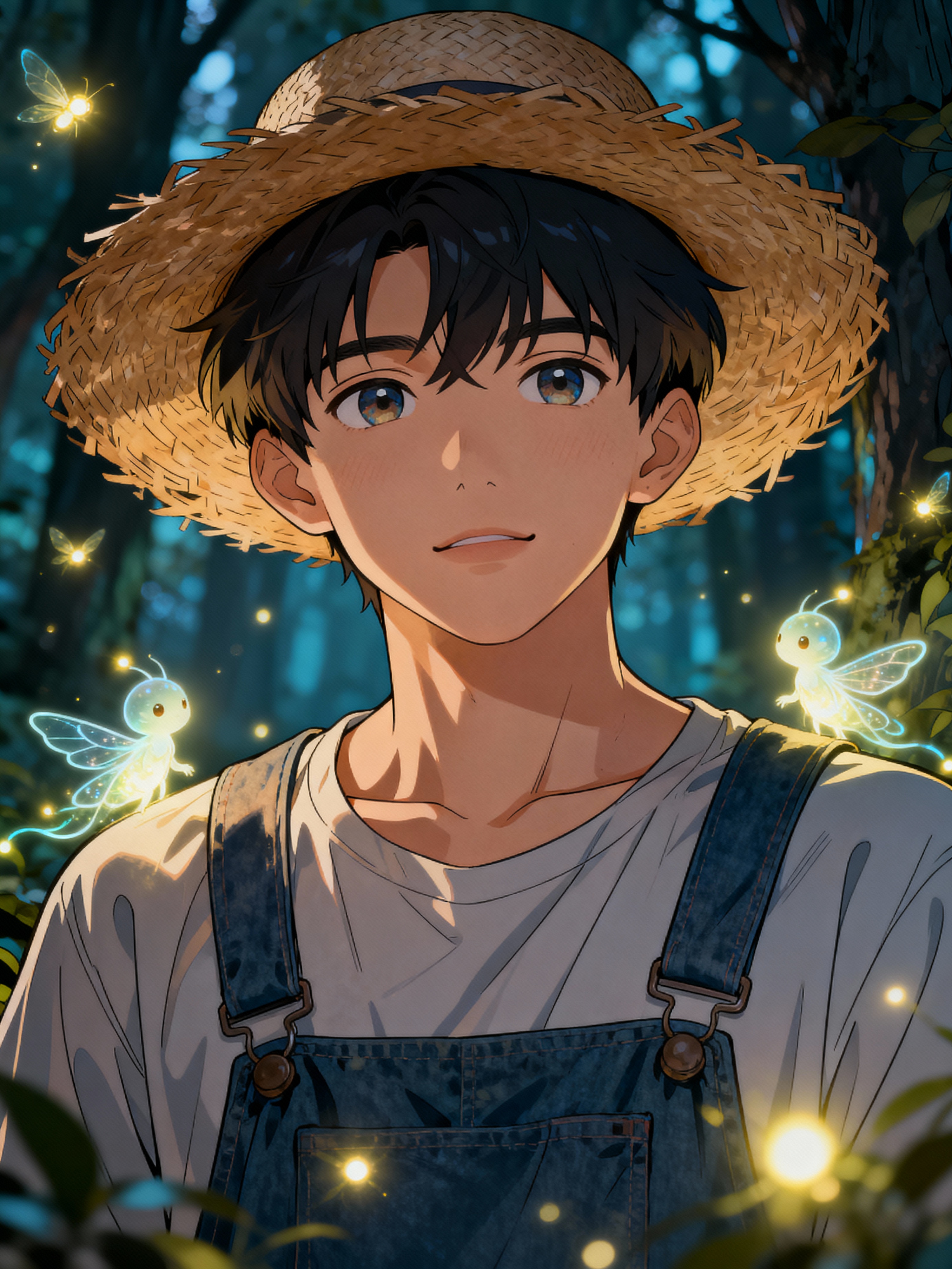 A cozy line art anime scene featuring model as a character in comfortable overalls and a straw hat, surrounded by magical forest spirits and glowing fireflies. The background has a dreamy forest clearing. The style is gentle and magical.