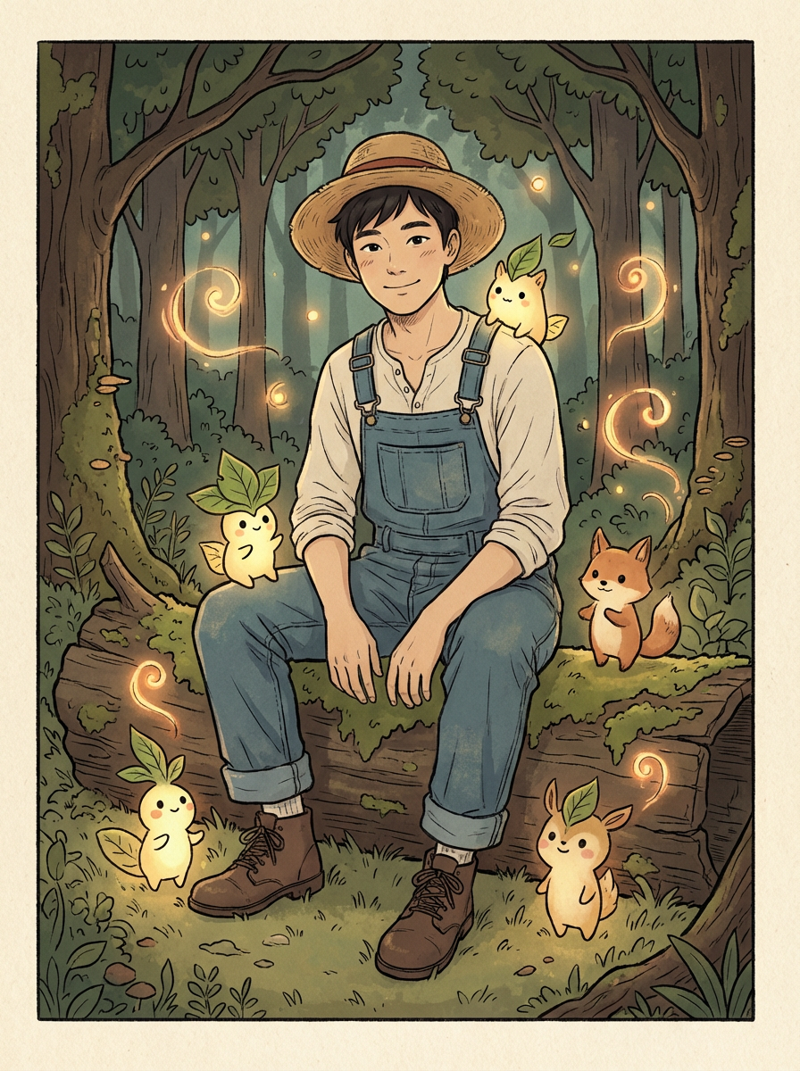 A cozy line art anime scene featuring model as a character in comfortable overalls and a straw hat, surrounded by magical forest spirits and glowing fireflies. The background has a dreamy forest clearing. The style is gentle and magical.