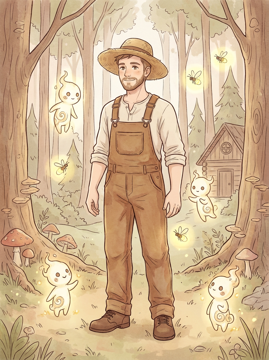 A cozy line art anime scene featuring model as a character in comfortable overalls and a straw hat, surrounded by magical forest spirits and glowing fireflies. The background has a dreamy forest clearing. The style is gentle and magical.