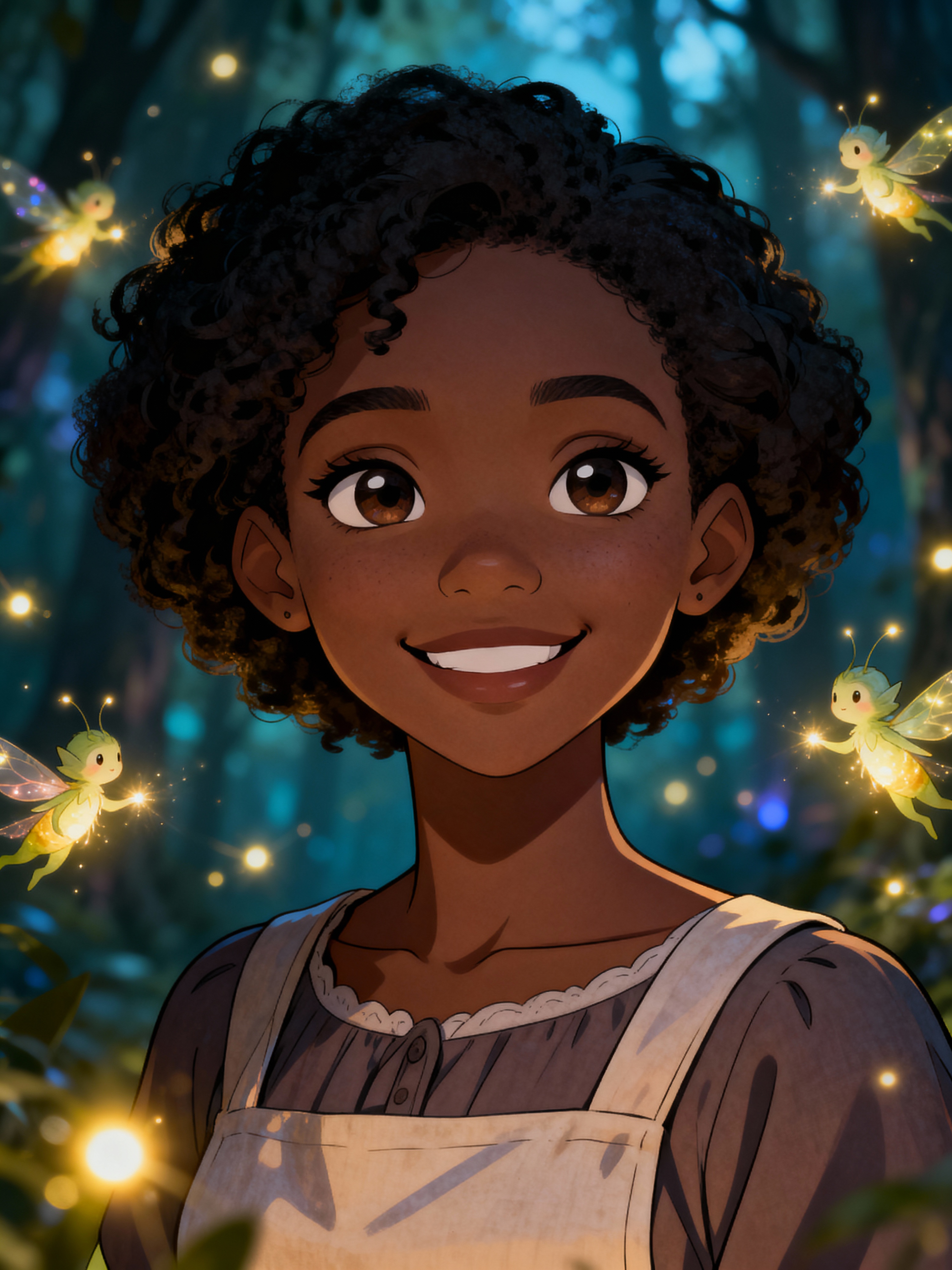 A cozy line art anime scene featuring model as a character in a simple dress with an apron and a warm smile , surrounded by magical forest spirits and glowing fireflies. The background has a dreamy forest clearing. The style is gentle and magical.