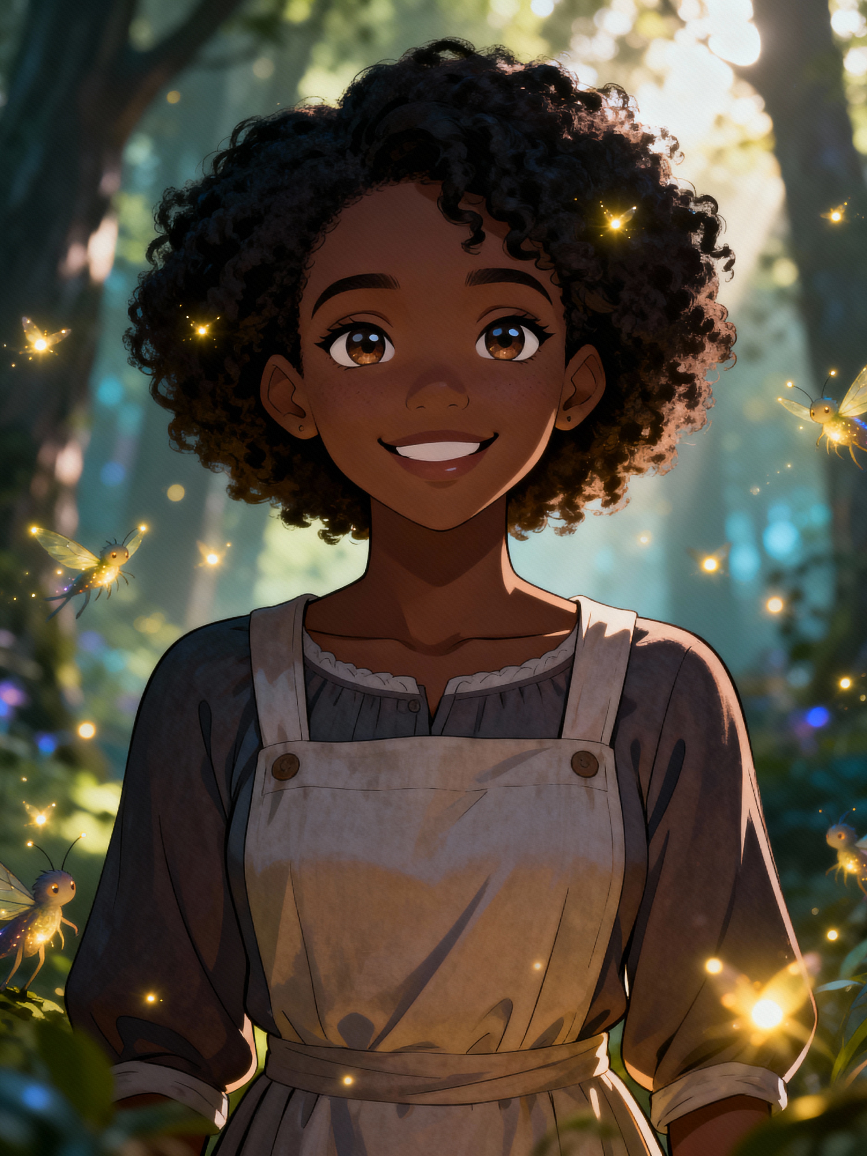 A cozy line art anime scene featuring model as a character in a simple dress with an apron and a warm smile , surrounded by magical forest spirits and glowing fireflies. The background has a dreamy forest clearing. The style is gentle and magical.