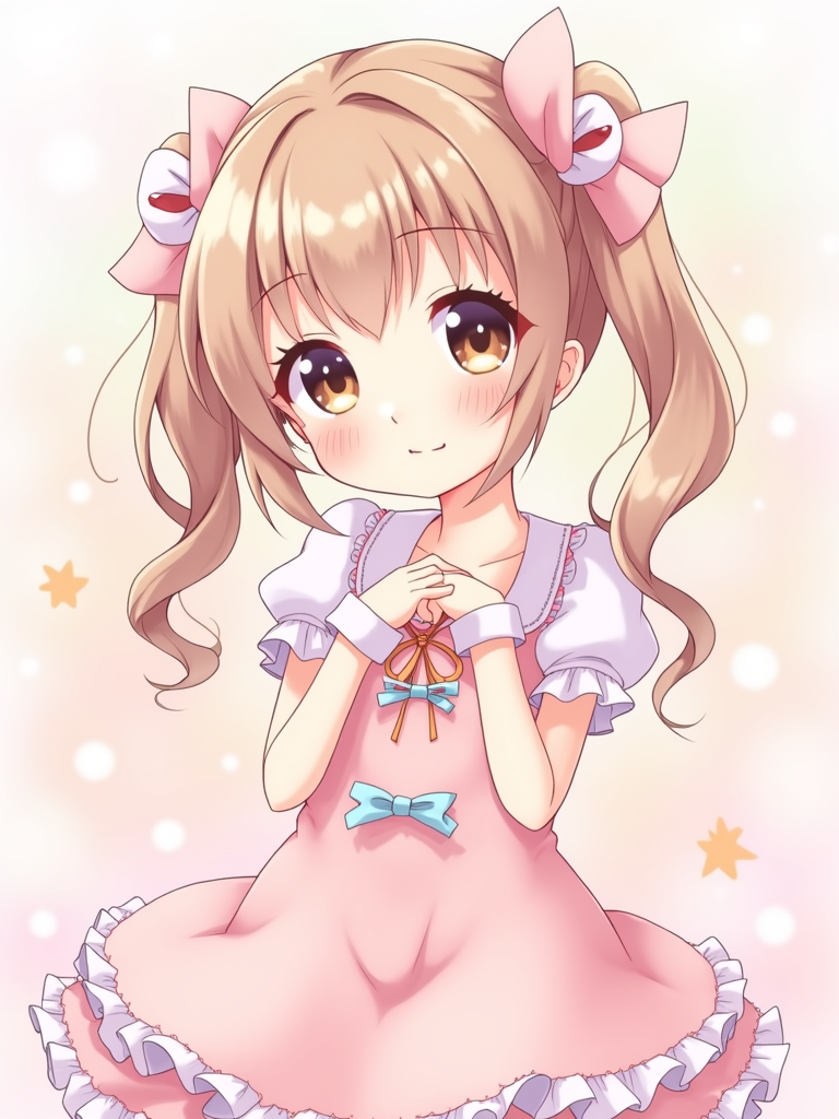 A cute kawaii anime girl avatar, featuring large sparkling eyes, a pastel-colored dress with ribbons and bows, playful pigtails . The background has dreamy pastel colors with soft sparkles. the style is in anime illustration.