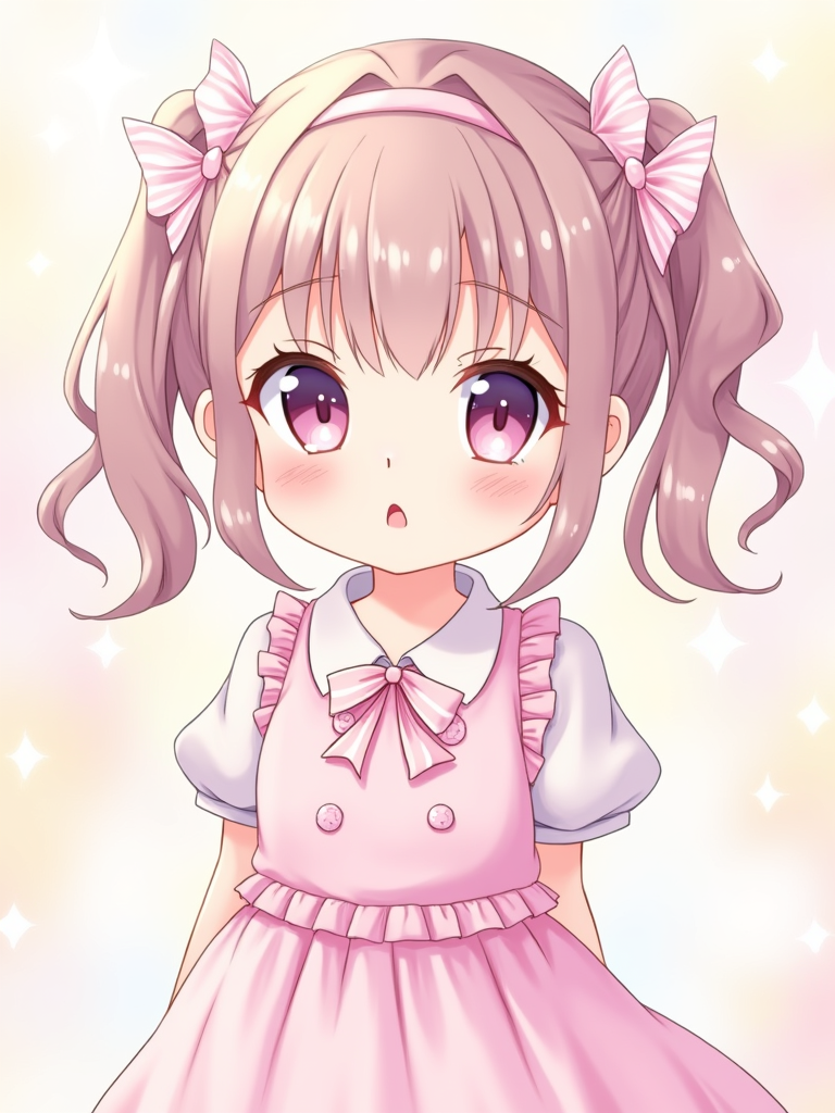 A cute kawaii anime girl avatar, featuring large sparkling eyes, a pastel-colored dress with ribbons and bows, playful pigtails . The background has dreamy pastel colors with soft sparkles. the style is in anime illustration.