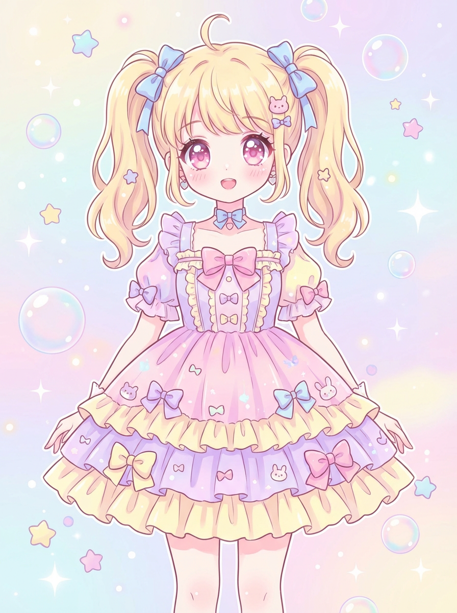 A cute kawaii anime girl avatar, featuring large sparkling eyes, a pastel-colored dress with ribbons and bows, playful pigtails . The background has dreamy pastel colors with soft sparkles. the style is in anime illustration.
