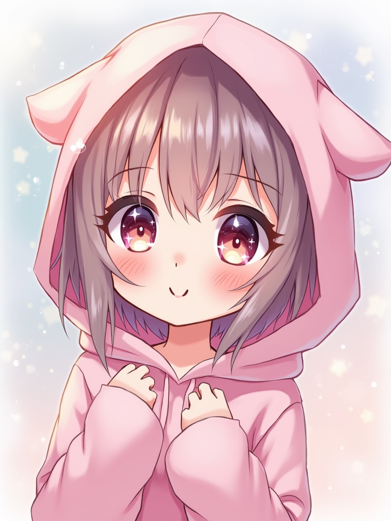 A cute kawaii anime girl avatar, featuring large sparkling eyes, a soft boy aesthetic with messy hair and oversized hoodie. The background has dreamy pastel colors with soft sparkles.