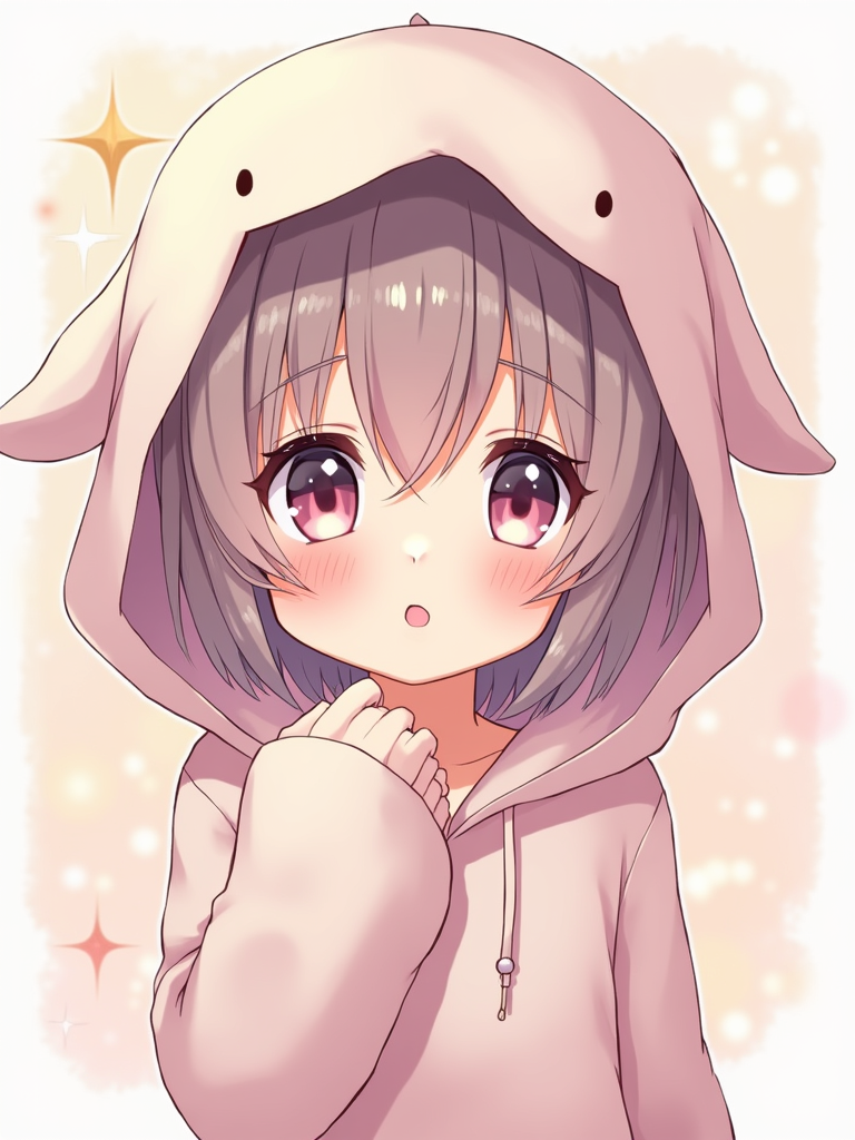 A cute kawaii anime girl avatar, featuring large sparkling eyes, a soft boy aesthetic with messy hair and oversized hoodie. The background has dreamy pastel colors with soft sparkles. the style is in anime illustration.