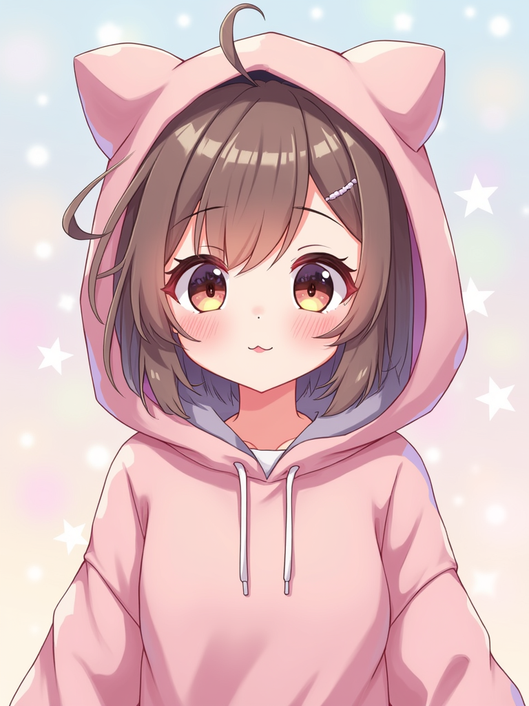 A cute kawaii anime girl avatar, featuring large sparkling eyes, a soft boy aesthetic with messy hair and oversized hoodie. The background has dreamy pastel colors with soft sparkles. the style is in anime illustration.