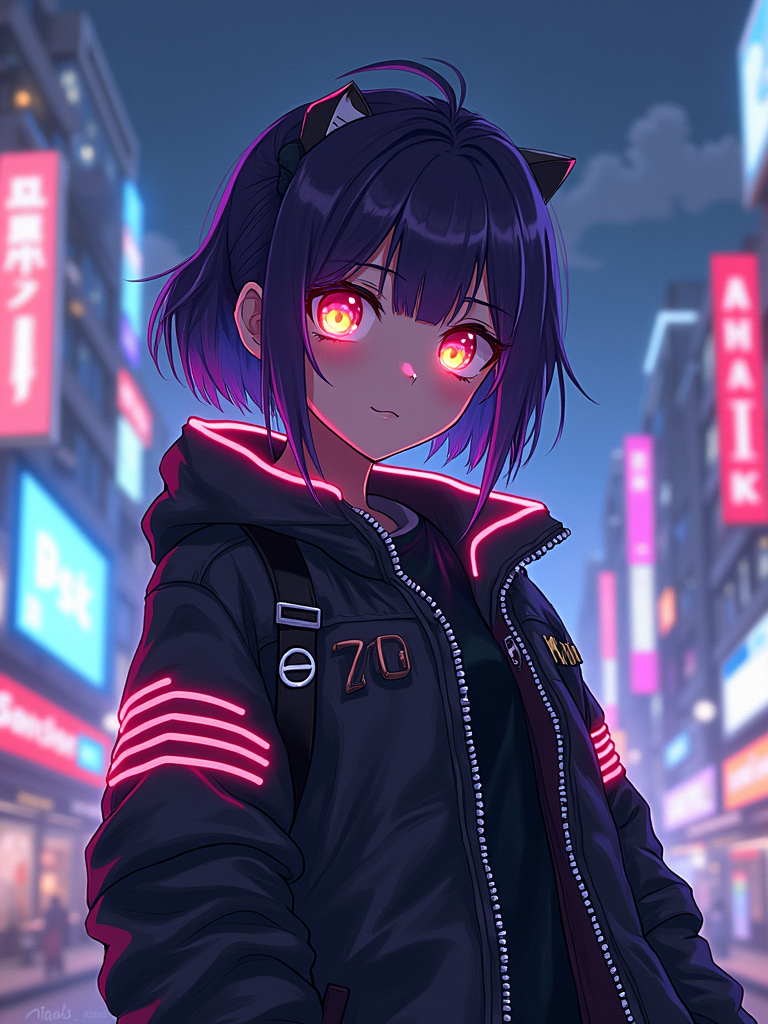 A cyberpunk anime-style character, with glowing neon elements, a cyber-enhanced jacket with neon streaks and cybernetic eyes. The city skyline behind is filled with digital billboards and vibrant lights. the style is in anime illustration.
