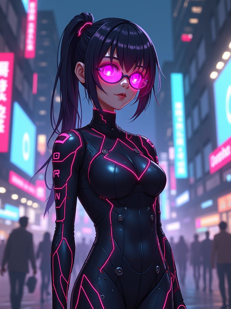 A cyberpunk anime-style character, with glowing neon elements, a futuristic bodysuit with LED accents and high-tech visor . The city skyline behind is filled with digital billboards and vibrant lights. the style is in anime illustration.