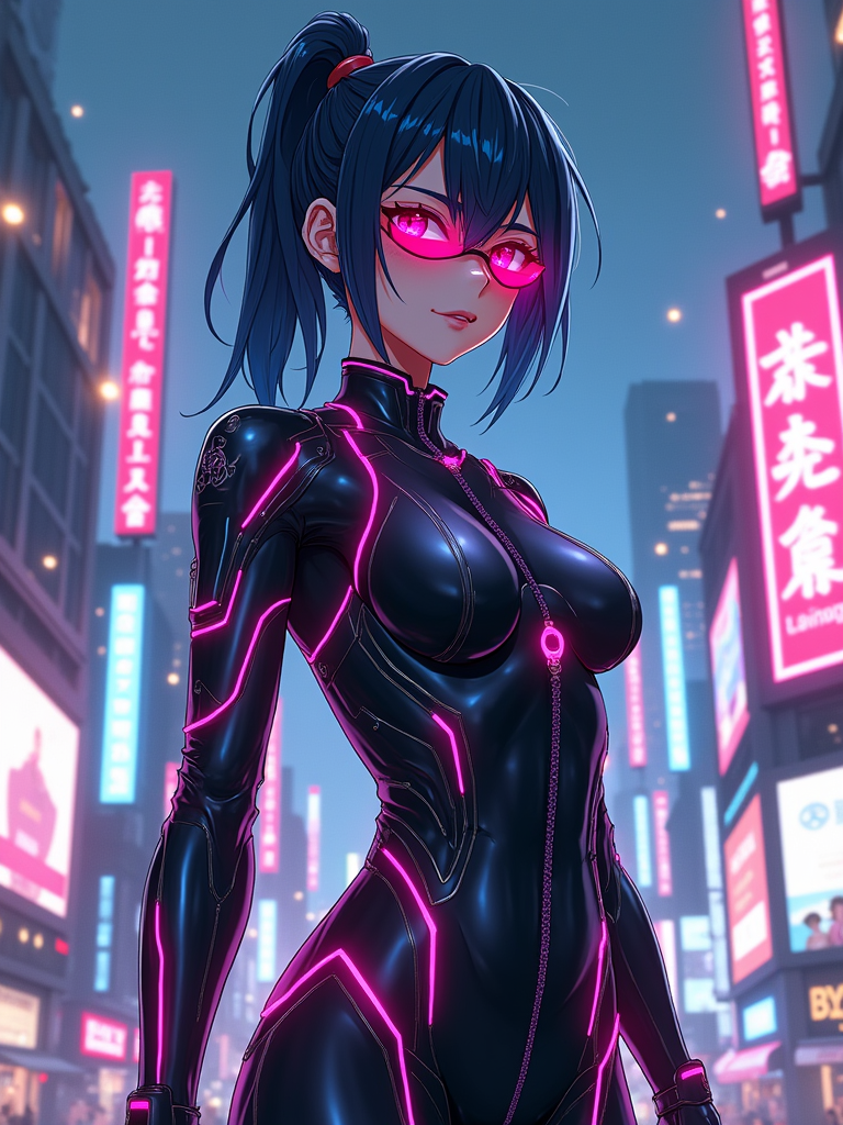 A cyberpunk anime-style character, with glowing neon elements, a futuristic bodysuit with LED accents and high-tech visor . The city skyline behind is filled with digital billboards and vibrant lights. the style is in anime illustration.