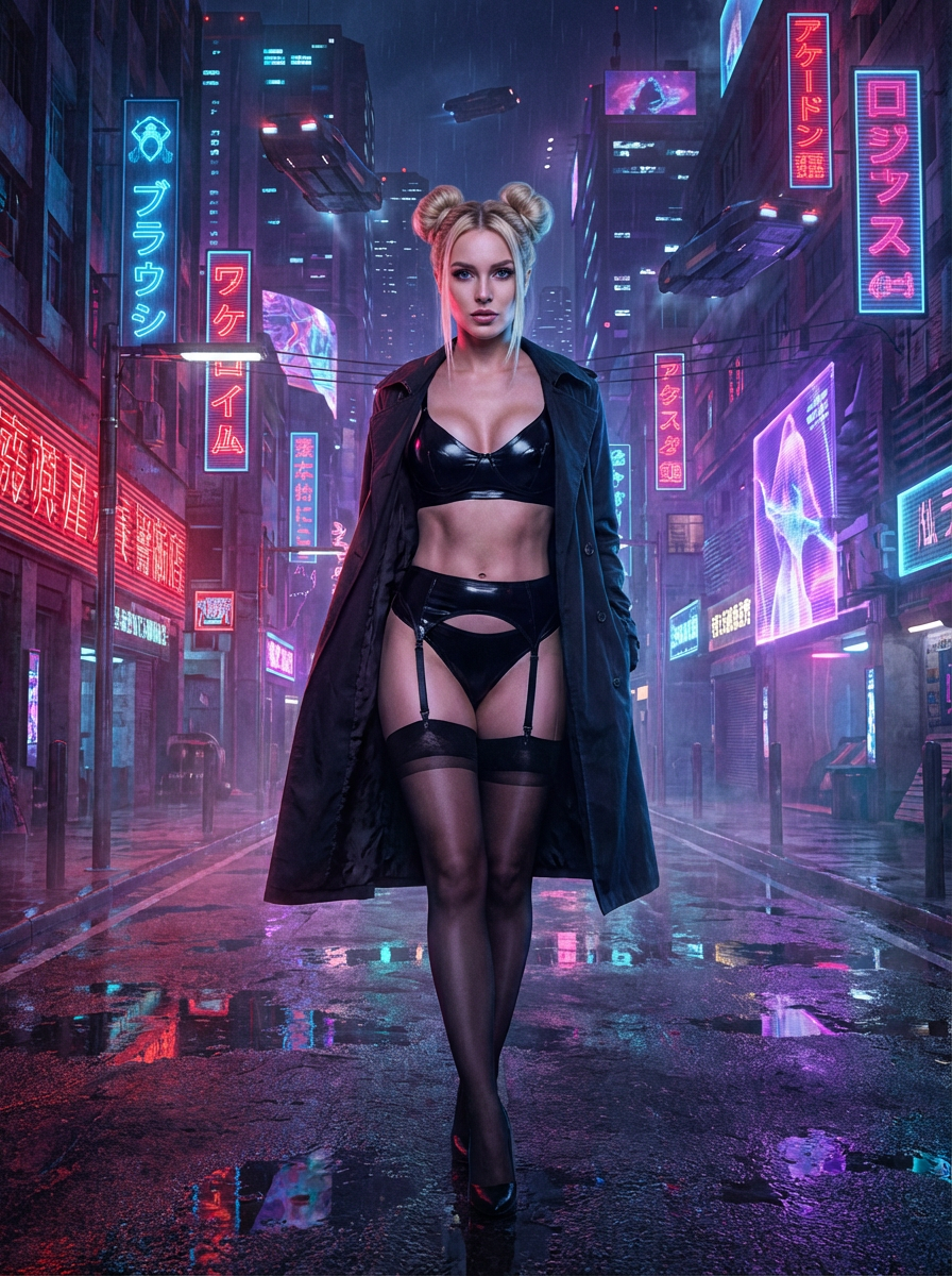 a detailed portrait of intelligent model actress standing in street wearing black stockings garter straps garter straps black lingerie pvx latex lingerie black, in a cyberpunk bladerunner vaporwave city, (cyberpunk), city from year 2300, red lights neon, blonde double hair bun