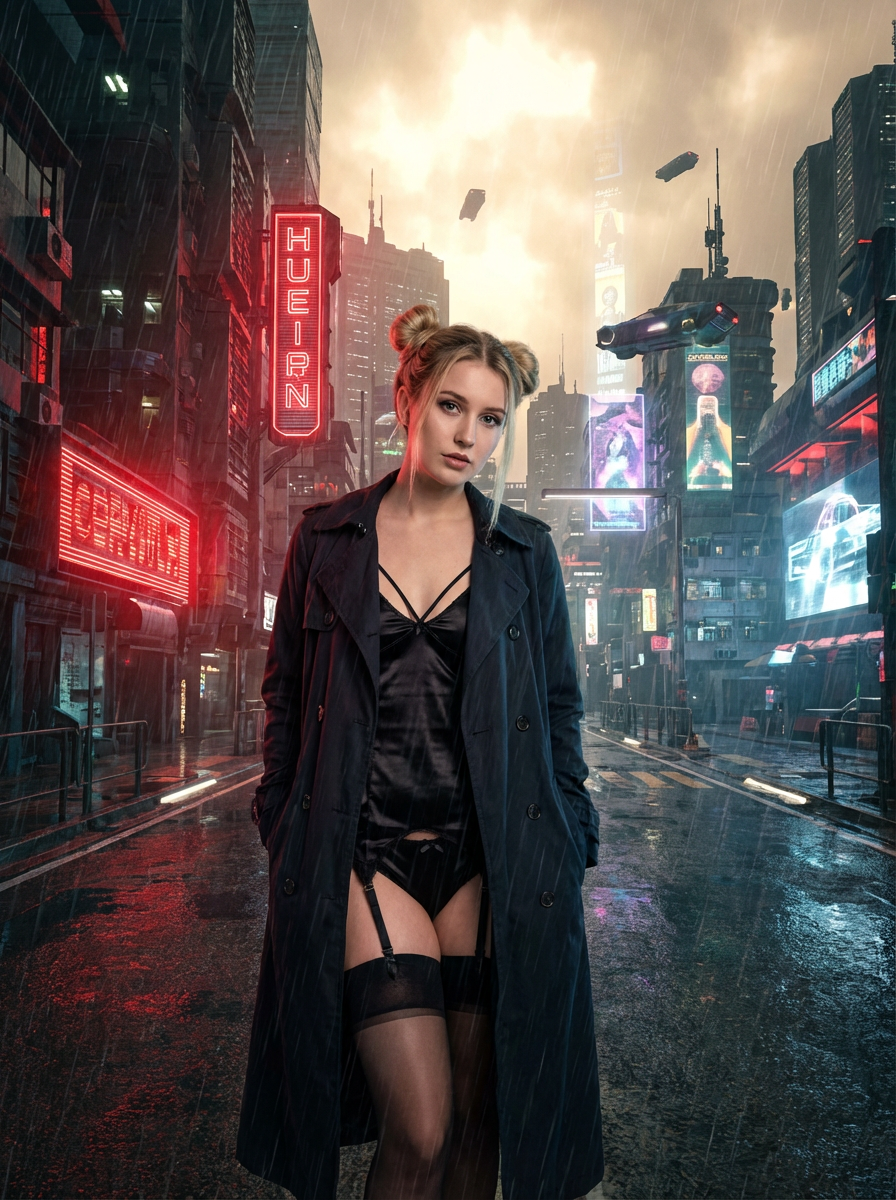 a detailed portrait of intelligent model actress standing in street wearing black stockings garter straps garter straps black lingerie silk lingerie black, in a cyberpunk bladerunner vaporwave city, (cyberpunk), city from year 2300, red lights neon, blonde double hair bun