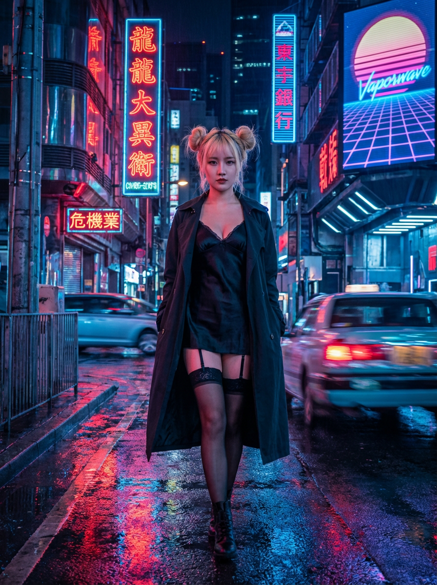 a detailed portrait of intelligent model actress standing in street wearing black stockings garter straps garter straps black lingerie silk lingerie black, in a cyberpunk bladerunner vaporwave city, (cyberpunk), city from year 2300, red lights neon, blonde double hair bun