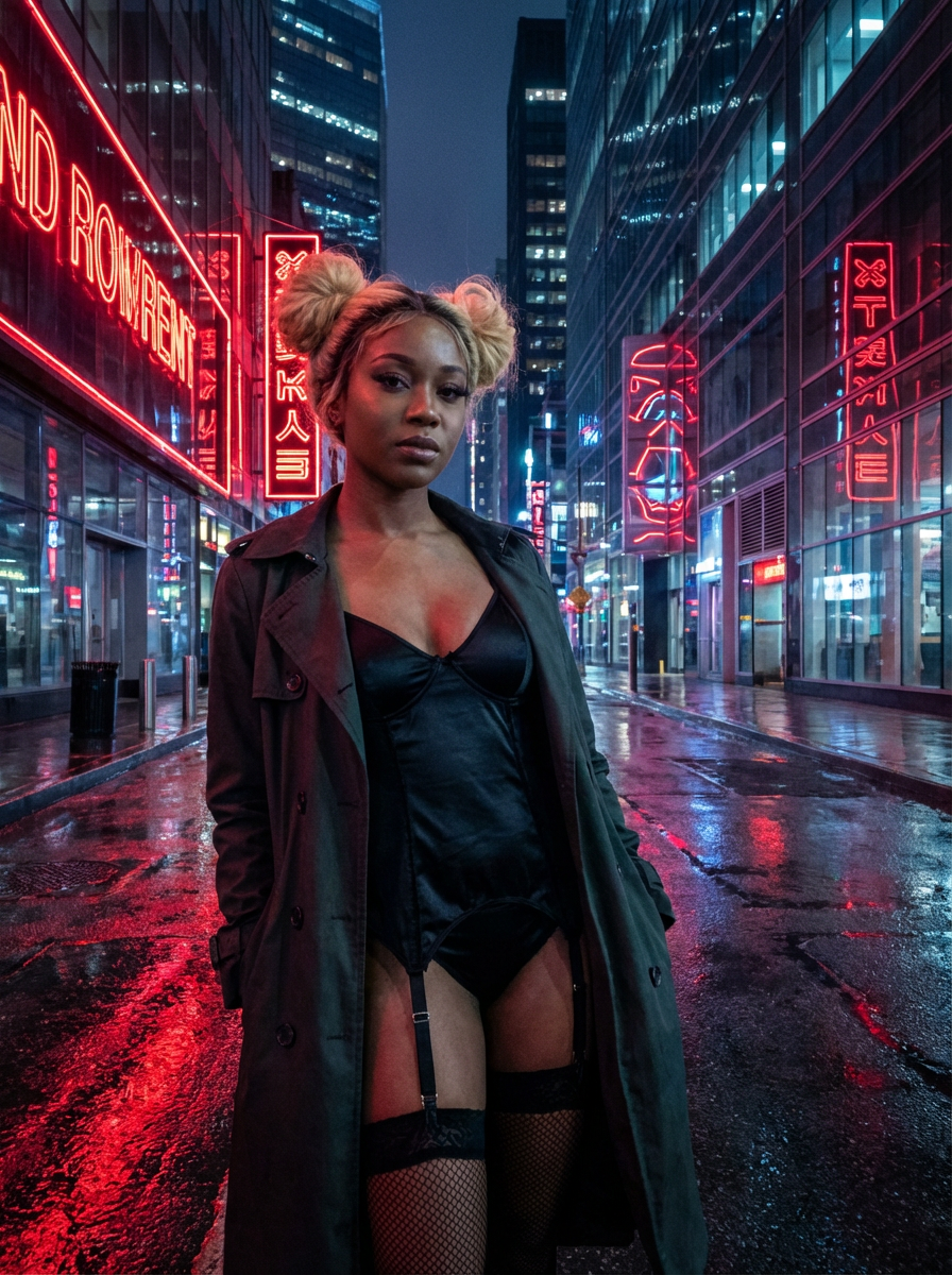 a detailed portrait of intelligent model actress standing in street wearing fishnet stockings garter straps garter straps black lingerie silk lingerie black, in a cyberpunk bladerunner vaporwave city, (cyberpunk), city from year 2300, red lights neon, blonde double hair bun