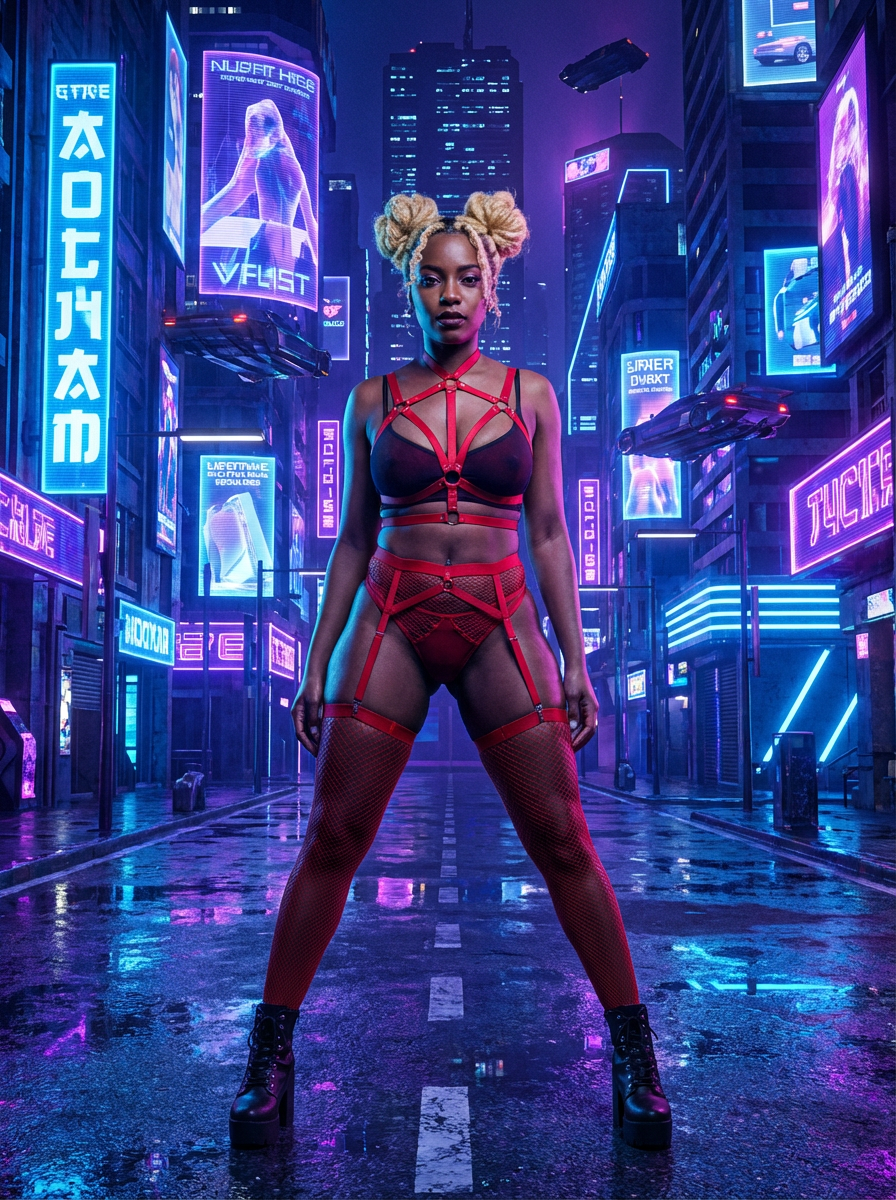 a detailed portrait of sexy intelligent hot glamour model standing wide legged strike a pose in street wearing (red fishnet red pantyhose stockings) garter straps garter straps red lingerie harness red lingerie lingerie red, in a cyberpunk bladerunner vaporwave city, (cyberpunk), city from year 2300, purple blue lights neon, blonde double hair bun, hourglass figure