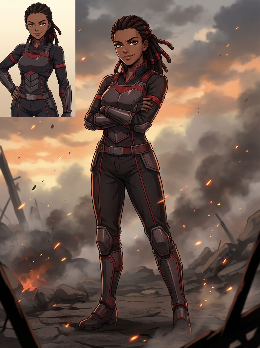 A dramatic anime-style character portrait of a shonen rival, standing with crossed arms and a confident smirk. The model wears a dark battle uniform with striking red accents and sharp, intense eyes . The background is a desolate battlefield with embers floating in the air. The style is in anime illustration.