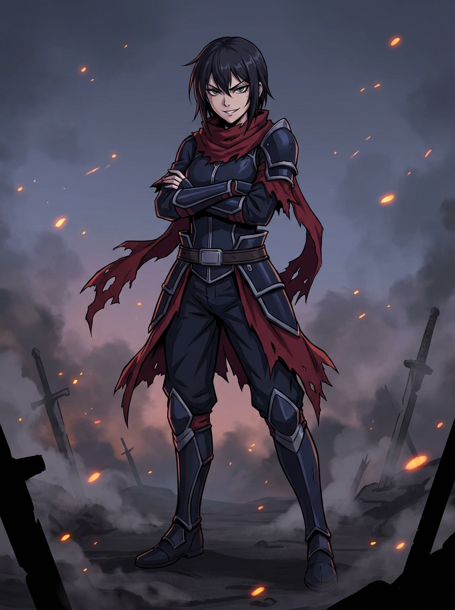 A dramatic anime-style character portrait of a shonen rival, standing with crossed arms and a confident smirk. The model wears a dark battle uniform with striking red accents and sharp, intense eyes . The background is a desolate battlefield with embers floating in the air. The style is in anime illustration.