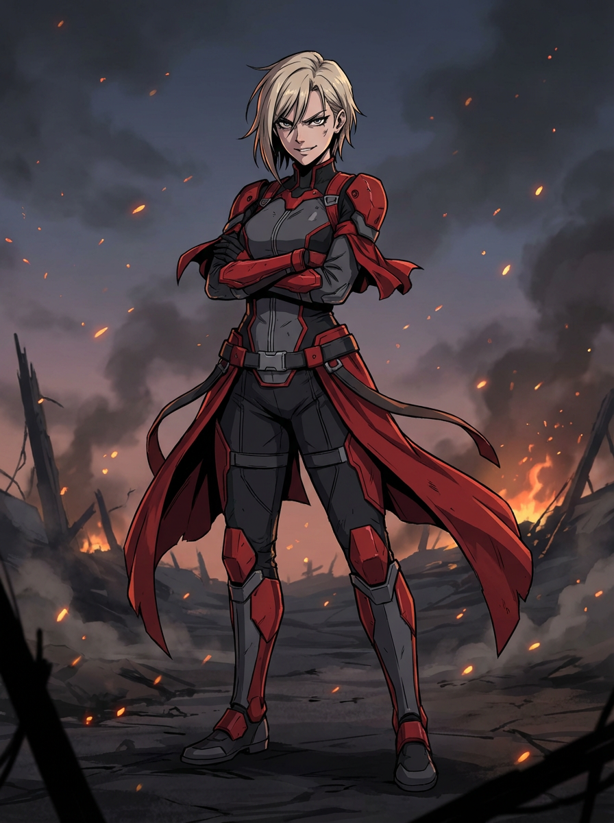 A dramatic anime-style character portrait of a shonen rival, standing with crossed arms and a confident smirk. The model wears a dark battle uniform with striking red accents and sharp, intense eyes . The background is a desolate battlefield with embers floating in the air. The style is in anime illustration.