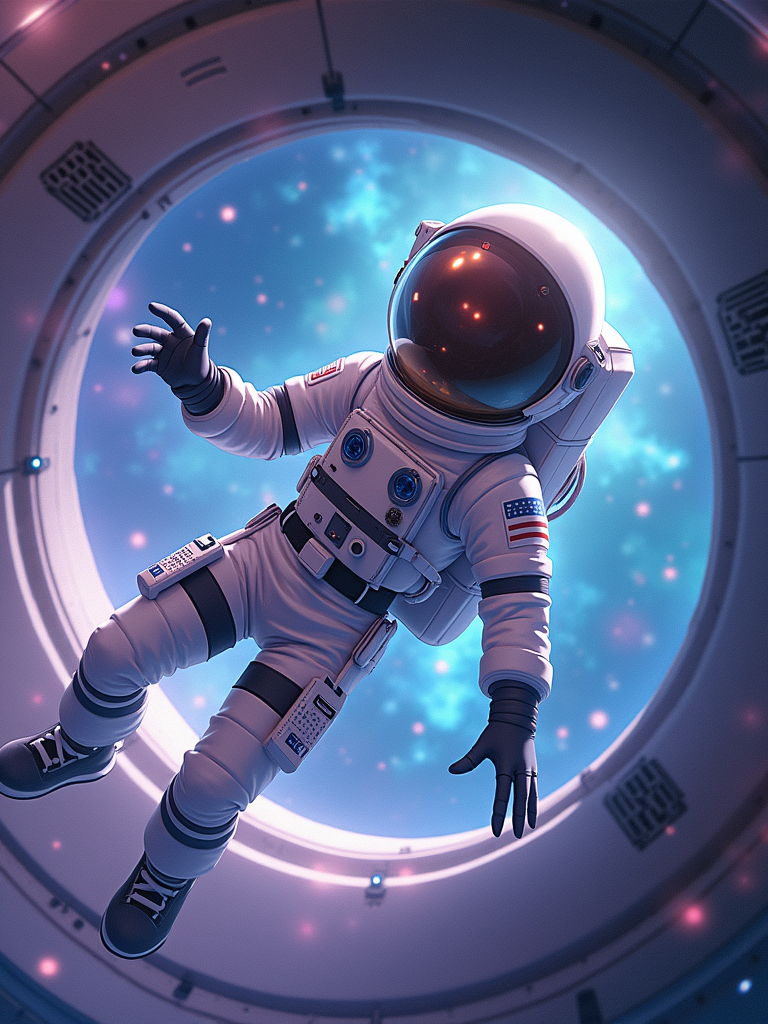 A dreamy anime space explorer, floating in a futuristic spaceship, wearing a high-tech astronaut suit with a reflective visor. The backdrop features distant galaxies and nebulae. the style is in anime illustration.