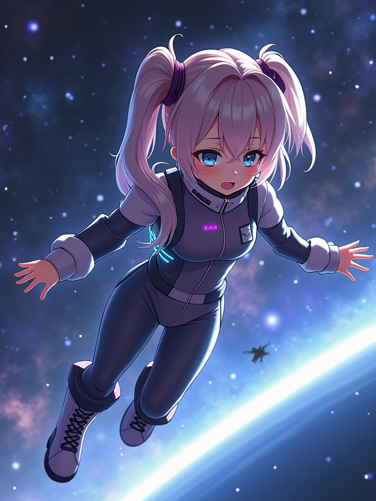 A dreamy anime space explorer, floating in a futuristic spaceship, wearing a sleek space pilot uniform with glowing accents . The backdrop features distant galaxies and nebulae. the style is in anime illustration.