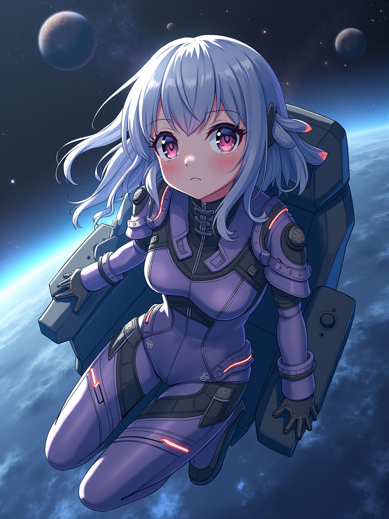 A dreamy anime space explorer, floating in a futuristic spaceship, wearing a sleek space pilot uniform with glowing accents . The backdrop features distant galaxies and nebulae. the style is in anime illustration.