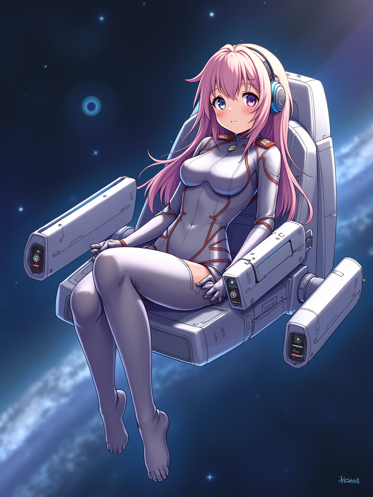A dreamy anime space explorer, floating in a futuristic spaceship, wearing a sleek space pilot uniform with glowing accents . The backdrop features distant galaxies and nebulae. the style is in anime illustration.
