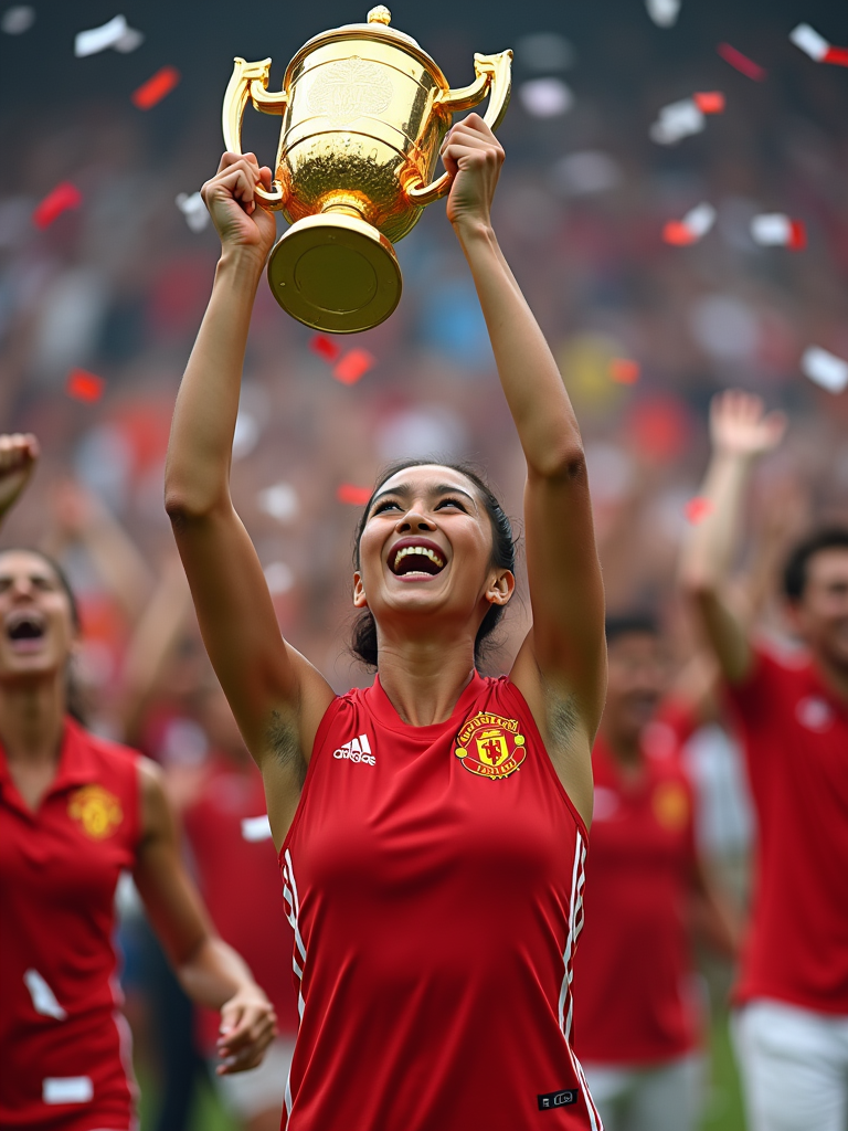 A famous athlete celebrating a championship victory, holding up a golden trophy while confetti falls around them. The model is wearing a sleek sports outfit with custom team branding . The roaring crowd in the background adds to the celebratory atmosphere.