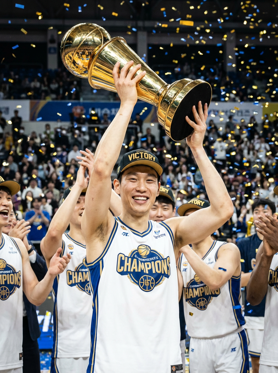 A famous athlete celebrating a championship victory, holding up a golden trophy while confetti falls around them. The model is wearing a fitted championship jersey with a victory cap. The roaring crowd in the background adds to the celebratory atmosphere.