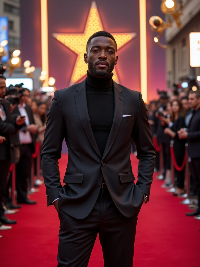 A famous Hollywood actor attending a blockbuster movie premiere, standing in front of a massive event backdrop featuring the movie title and logo. The model is dressed in a smart, fitted blazer over a turtleneck with leather dress shoes. The atmosphere is filled with eager fans and flashing paparazzi cameras.