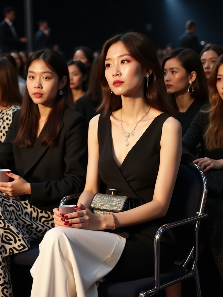 A famous influencer at an exclusive fashion show in Paris, sitting in the front row while watching womans walk the runway. The model is wearing a chic monochrome dress with a designer clutch . The runway is elegantly lit, with other elite guests seated nearby.