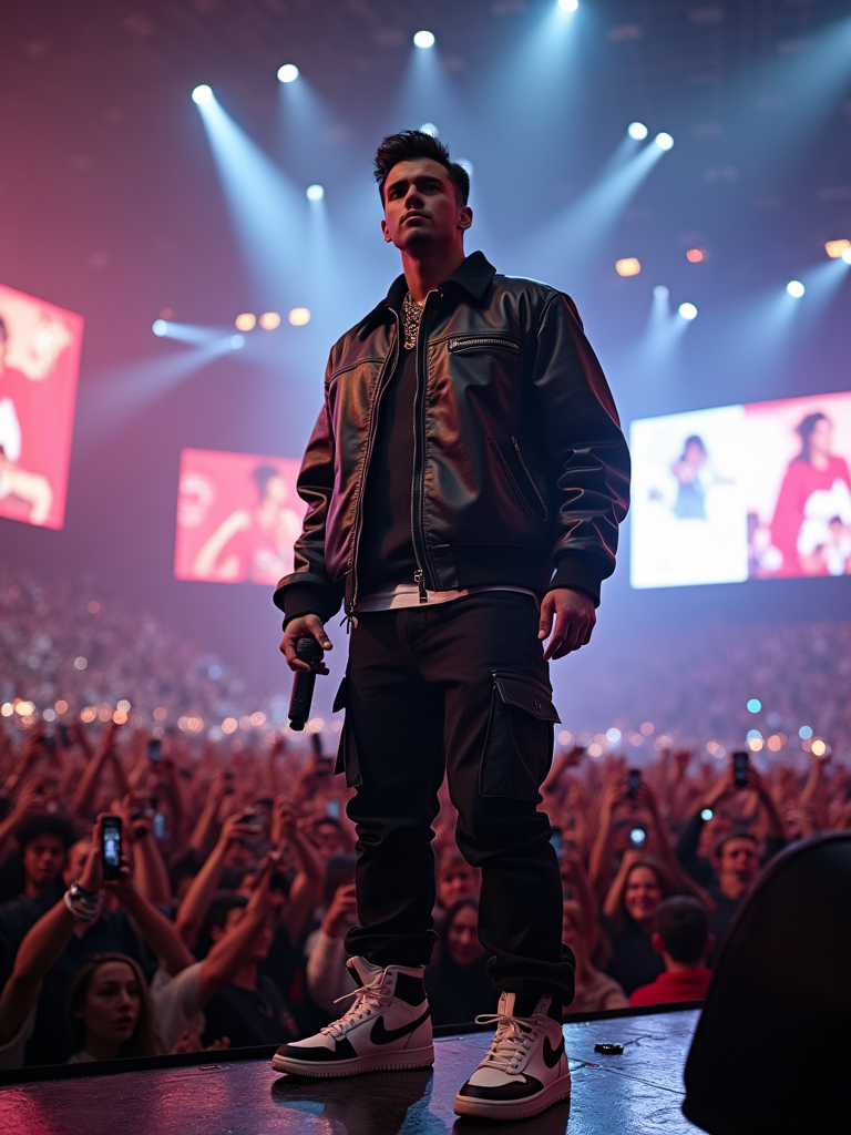 A famous rapper performing at a packed stadium concert, standing on a massive stage with LED screens and special effects. The model is wearing a custom oversized leather jacket with designer pants and high-end sneakers. The audience holds their phones up, capturing the moment.