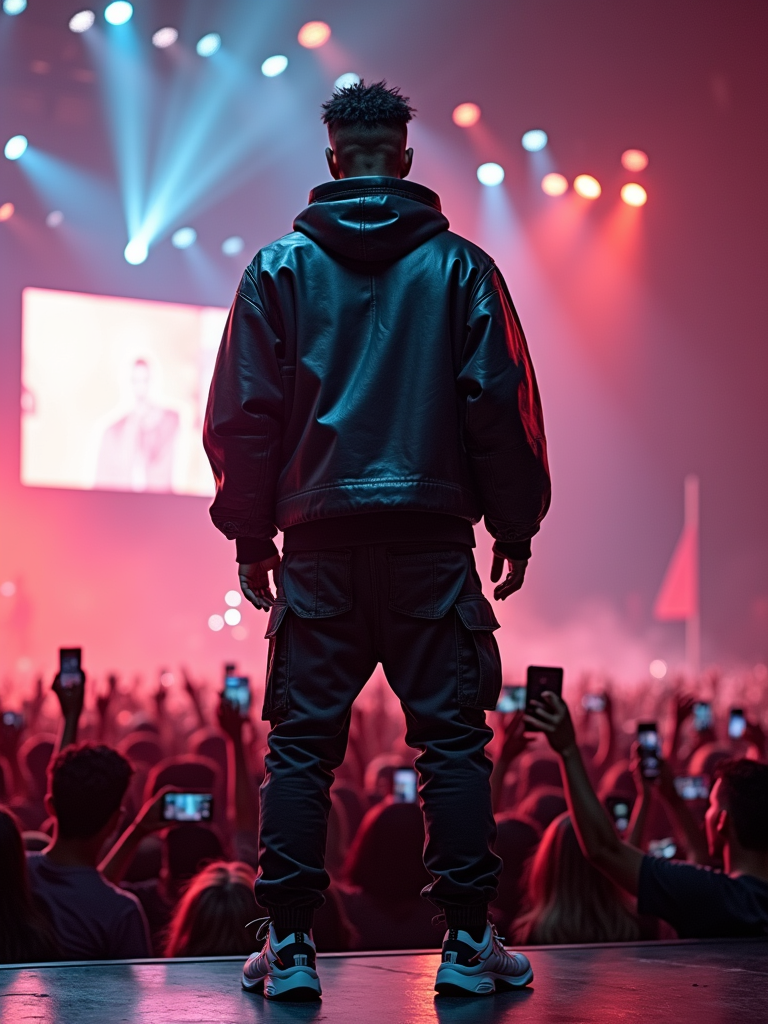 A famous rapper performing at a packed stadium concert, standing on a massive stage with LED screens and special effects. The model is wearing a custom oversized leather jacket with designer pants and high-end sneakers. The audience holds their phones up, capturing the moment.