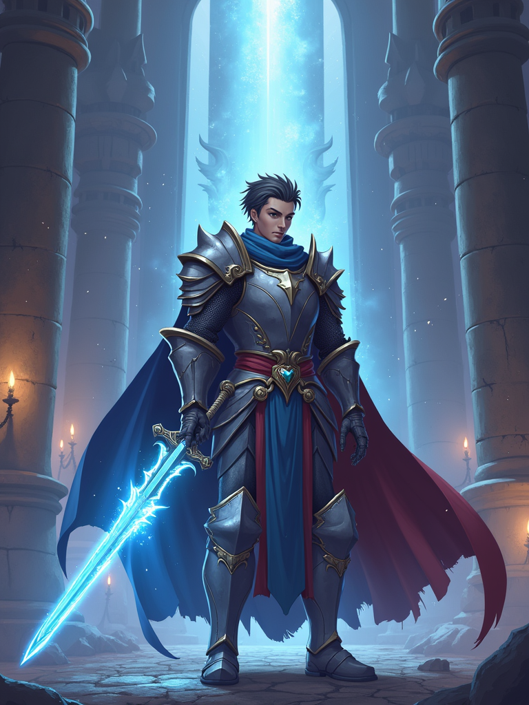 A fantasy anime warrior avatar, dressed in a legendary knight armor with a majestic cape and glowing sword. The setting is a grand castle with mystical energy radiating.