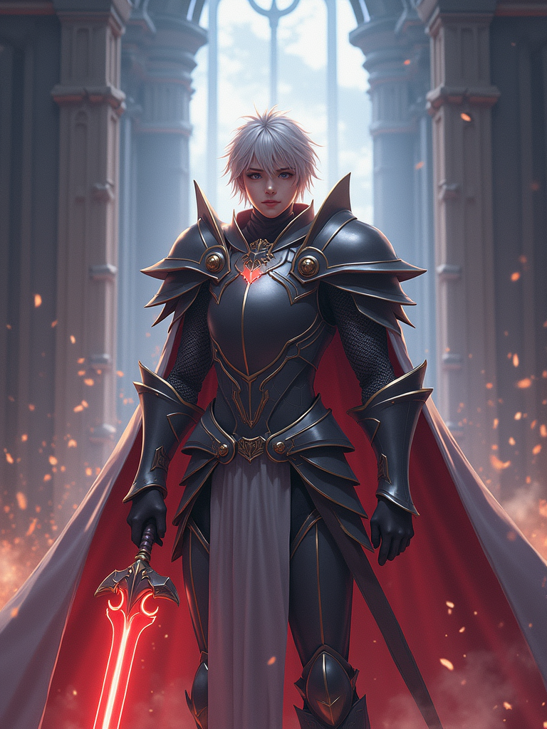 A fantasy anime warrior avatar, dressed in a legendary knight armor with a majestic cape and glowing sword. The setting is a grand castle with mystical energy radiating.
