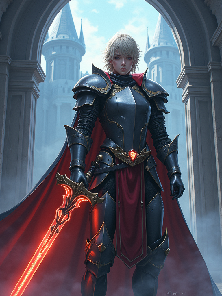 A fantasy anime warrior avatar, dressed in a legendary knight armor with a majestic cape and glowing sword. The setting is a grand castle with mystical energy radiating.