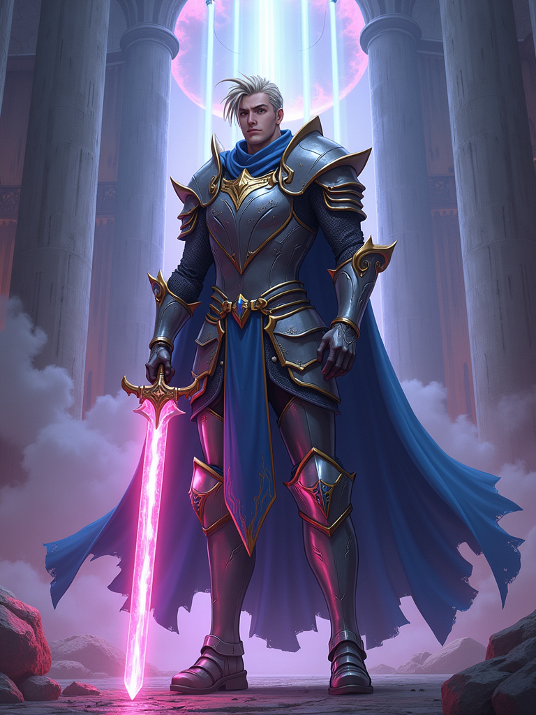 A fantasy anime warrior avatar, dressed in a legendary knight armor with a majestic cape and glowing sword. The setting is a grand castle with mystical energy radiating. the style is in anime illustration.
