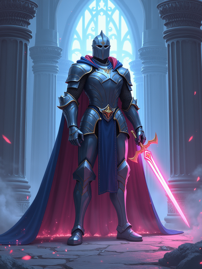 A fantasy anime warrior avatar, dressed in a legendary knight armor with a majestic cape and glowing sword. The setting is a grand castle with mystical energy radiating. the style is in anime illustration.